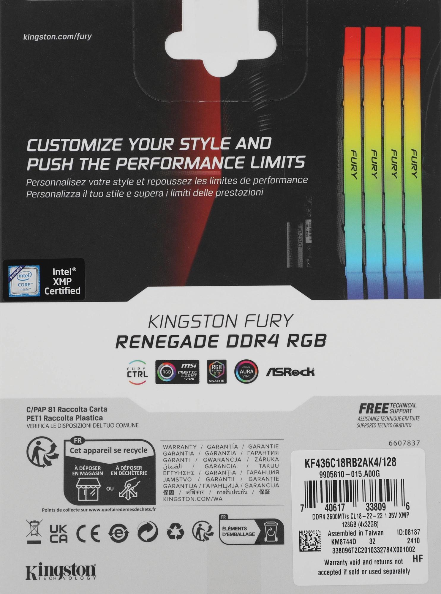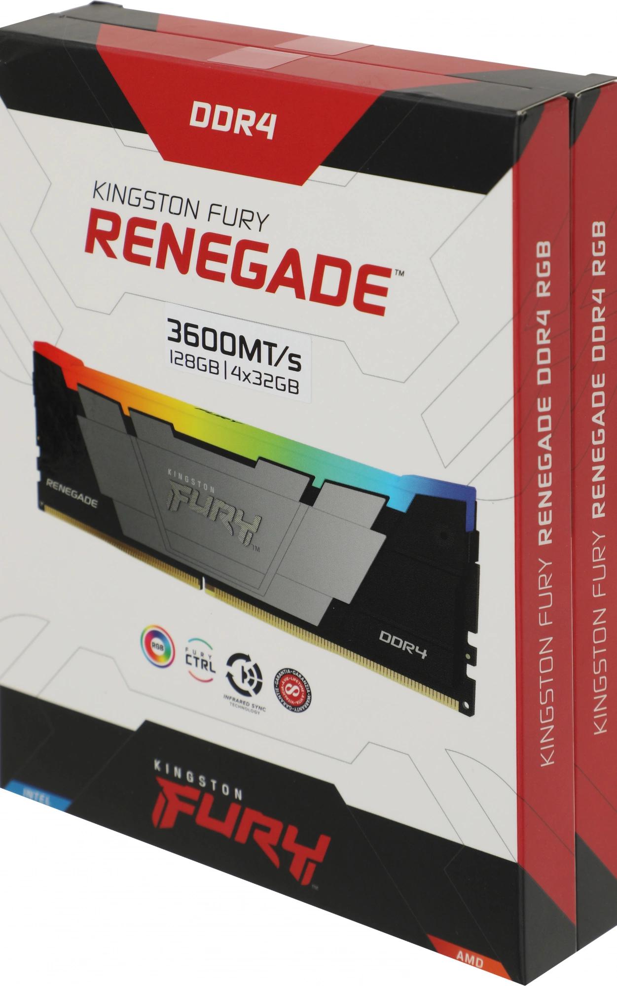Память DDR4 4x32GB 3600MHz Kingston KF436C18RB2AK4/128 Fury Renegade RGB RTL Gaming PC4-28800 CL18 DIMM 288-pin 1.35В dual rank с радиатором Ret