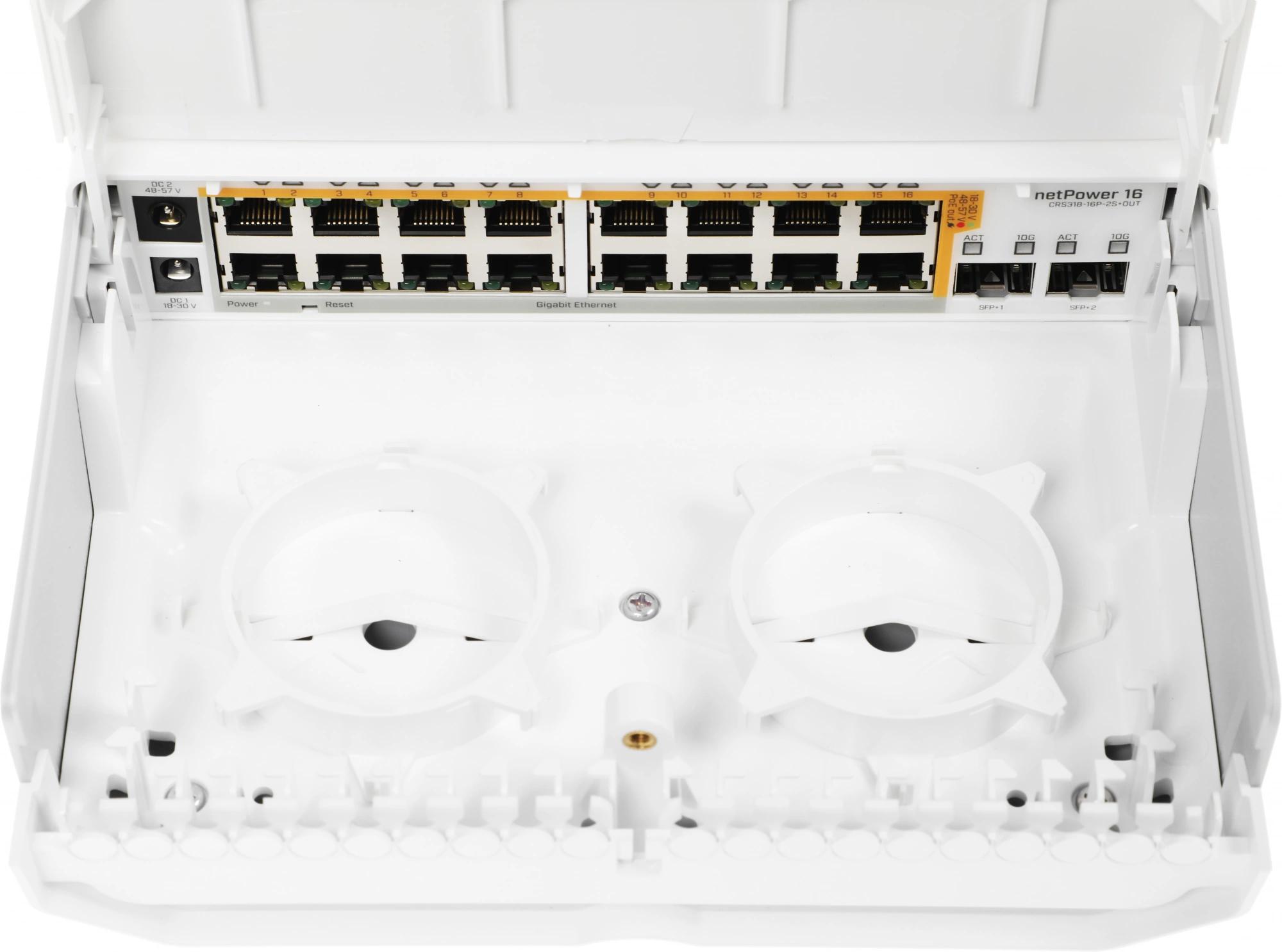 Всепогодный 18-портовый коммутатор с функцией раздачи PoE-питания на 16 гигабитных портах и двумя портами SFP+ (10 Гбит/с) — сверхпростой способ запитать множество точек доступа или IP-камер, а также оборудование нескольких восходящих каналов, размещённое на телекоммуникационной вышке.