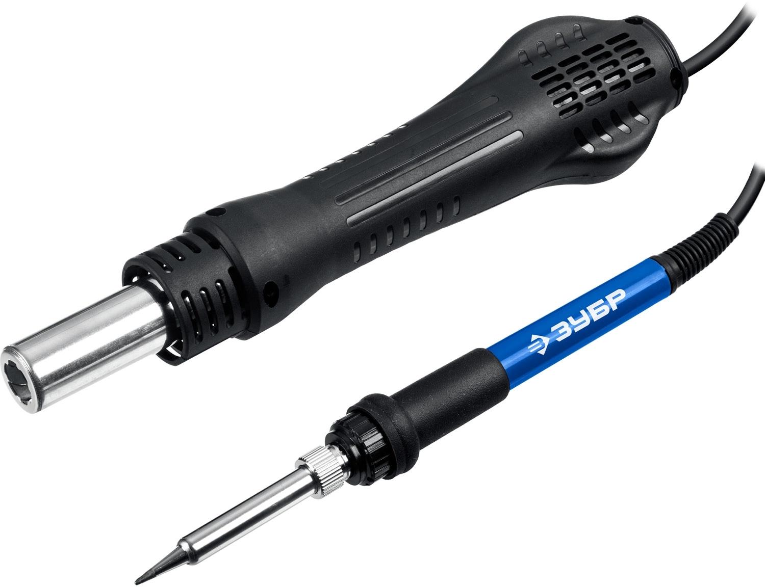 Станция паяльная 2в1, термофен, паяльник, подставка, сменные жала для термофена - 3 шт., сменные жала для паяльника - 5 шт., руководство по эксплуатации.
