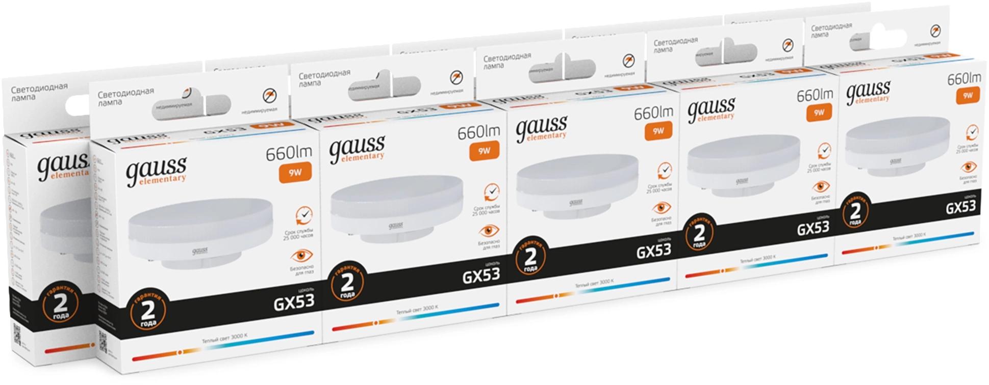Лампа светодиодная Gauss Elementary 9Вт цок.:GX53 таблетка 220B св.свеч.бел.теп. Tablet (упак.:10шт) (83819)