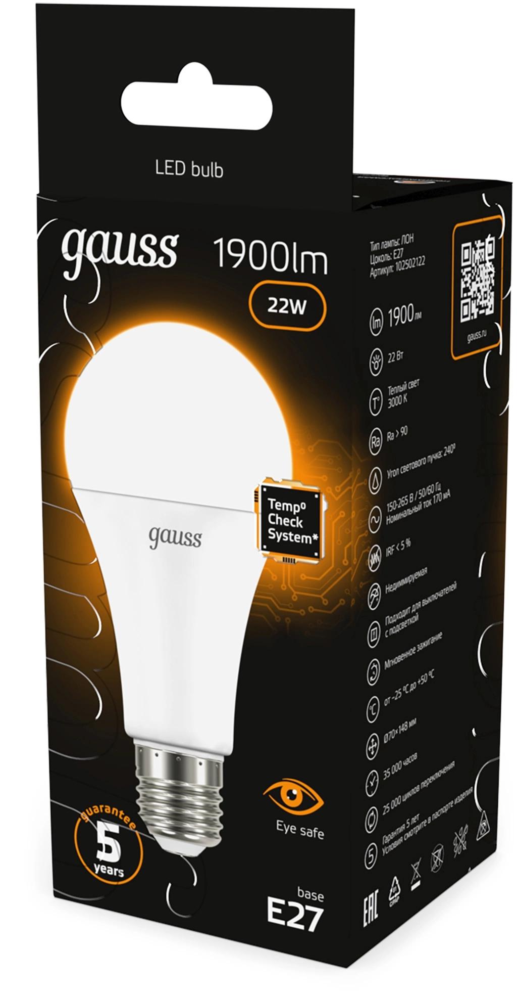 Лампа светодиодная Gauss A70 22Вт цок.:E27 груша 220B св.свеч.бел.теп. (упак.:10шт) (102502122)