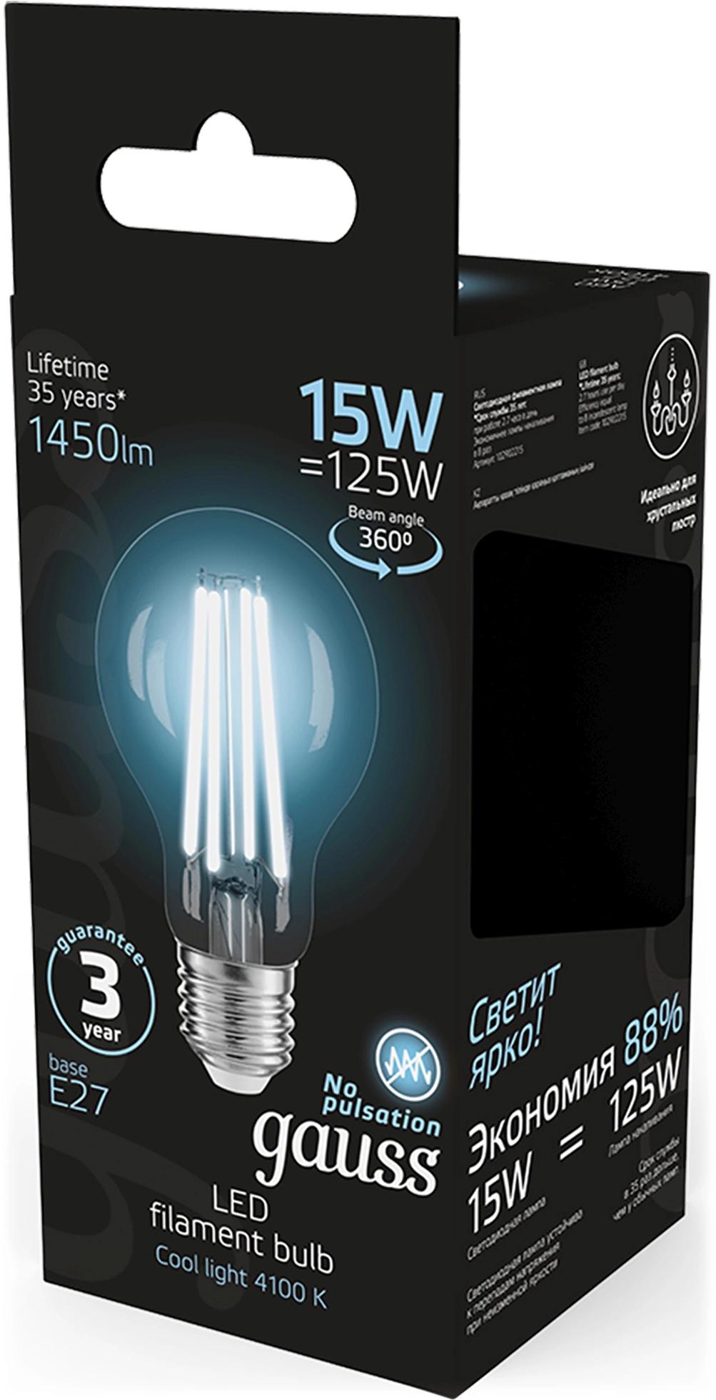 Лампа светодиодная Gauss Filament 102902215 15Вт цок.:E27 груша 220B св.свеч.бел.нейт. (упак.:10шт)