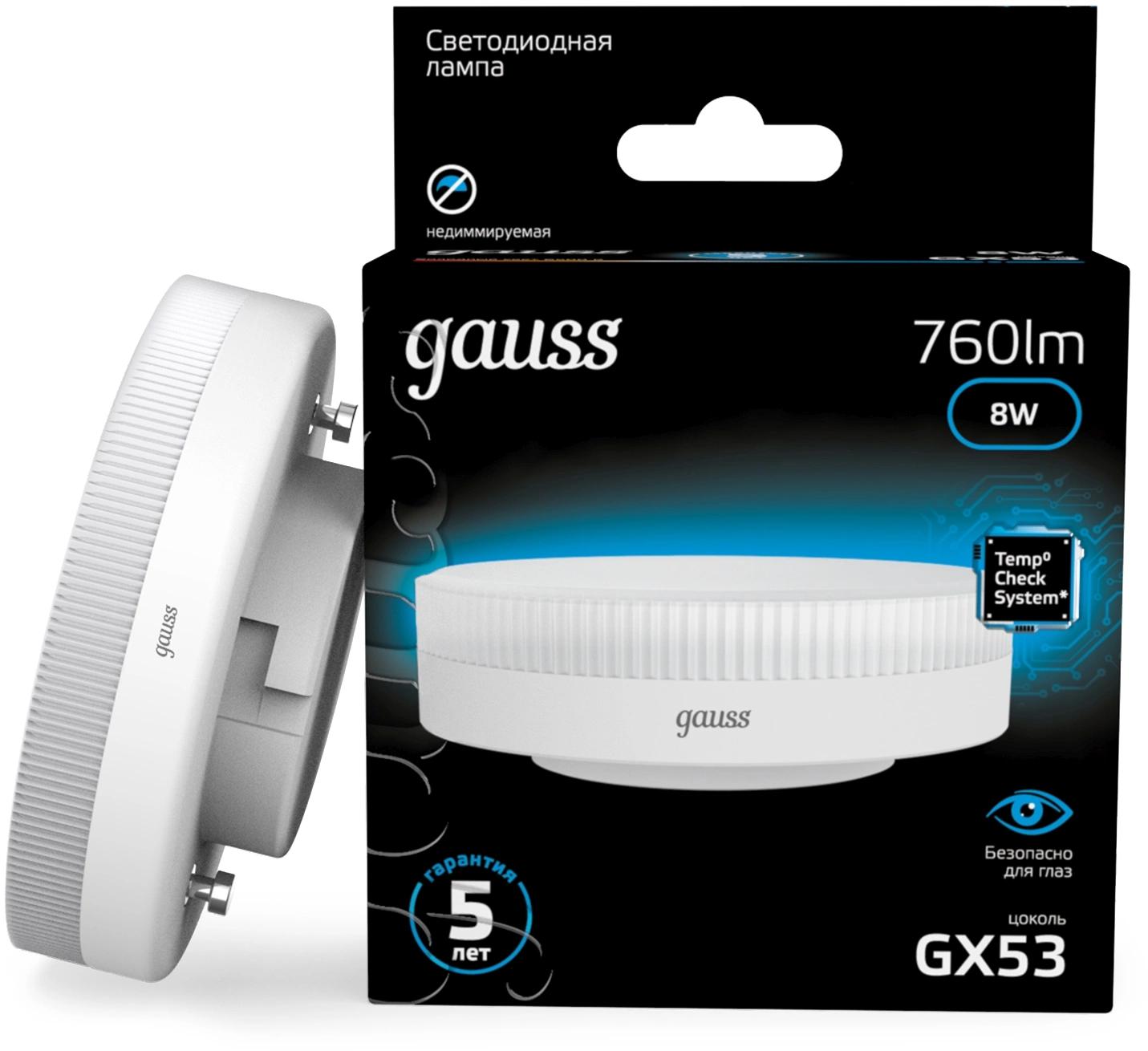 Лампа светодиодная Gauss 108008308 8Вт цок.:GX53 таблетка 150B св.свеч.бел.хол. GX53 (упак.:10шт)