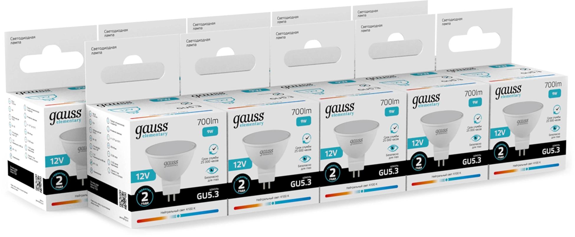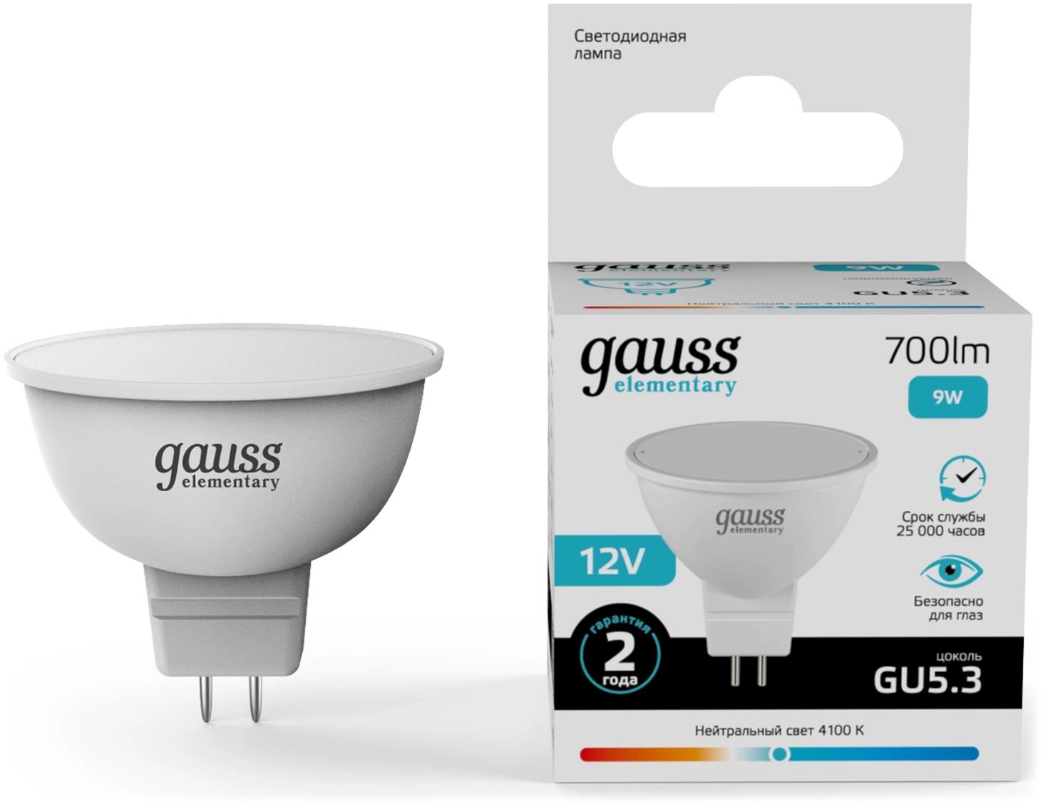 Лампа светодиодная Gauss Elementary 9Вт цок.:GU5.3 софит 12B св.свеч.бел.нейт. (упак.:10шт) (11529)