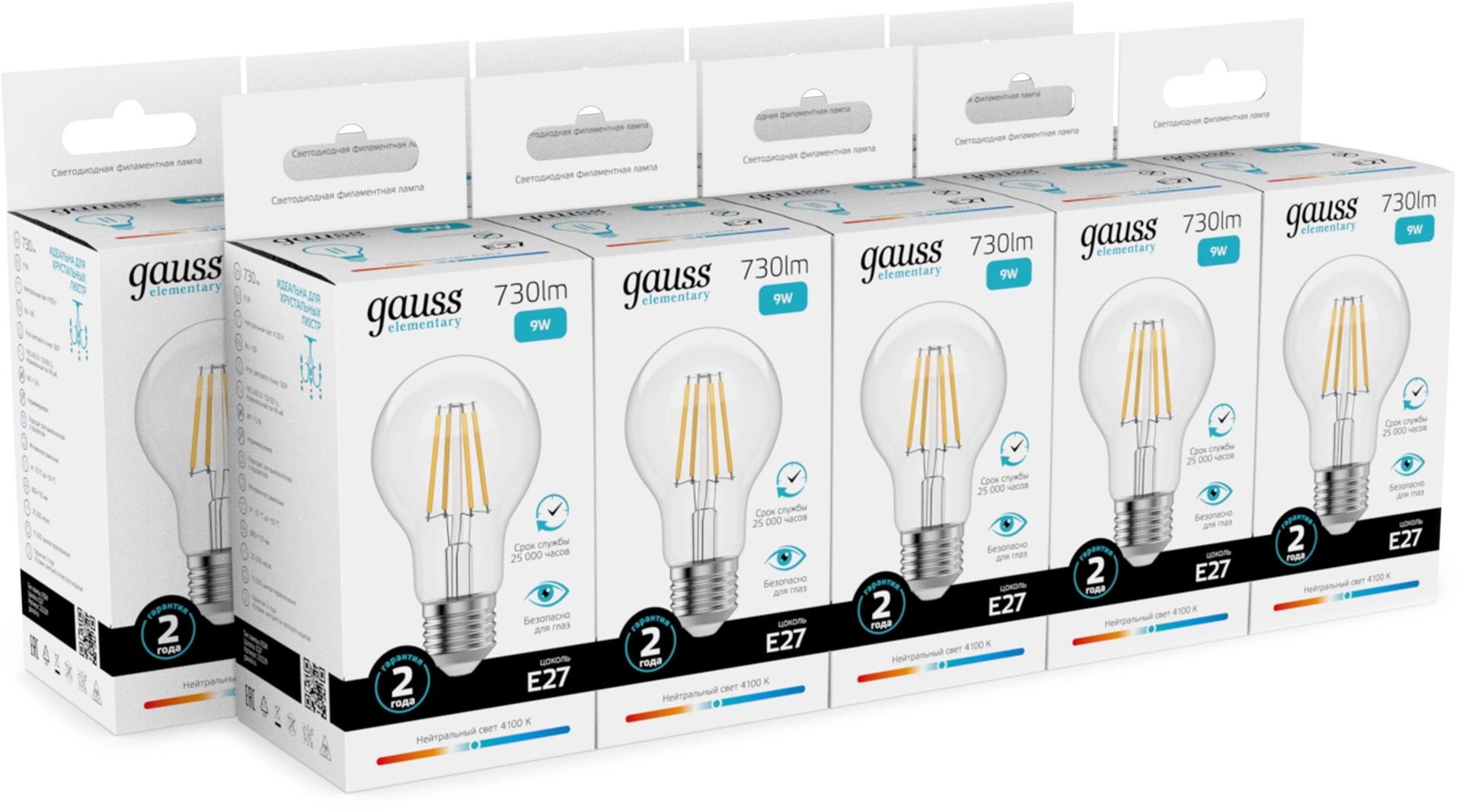 Лампа филам. Gauss Filament 9Вт цок.:E27 груша 220B св.свеч.бел.нейт. (упак.:10шт) (22229)