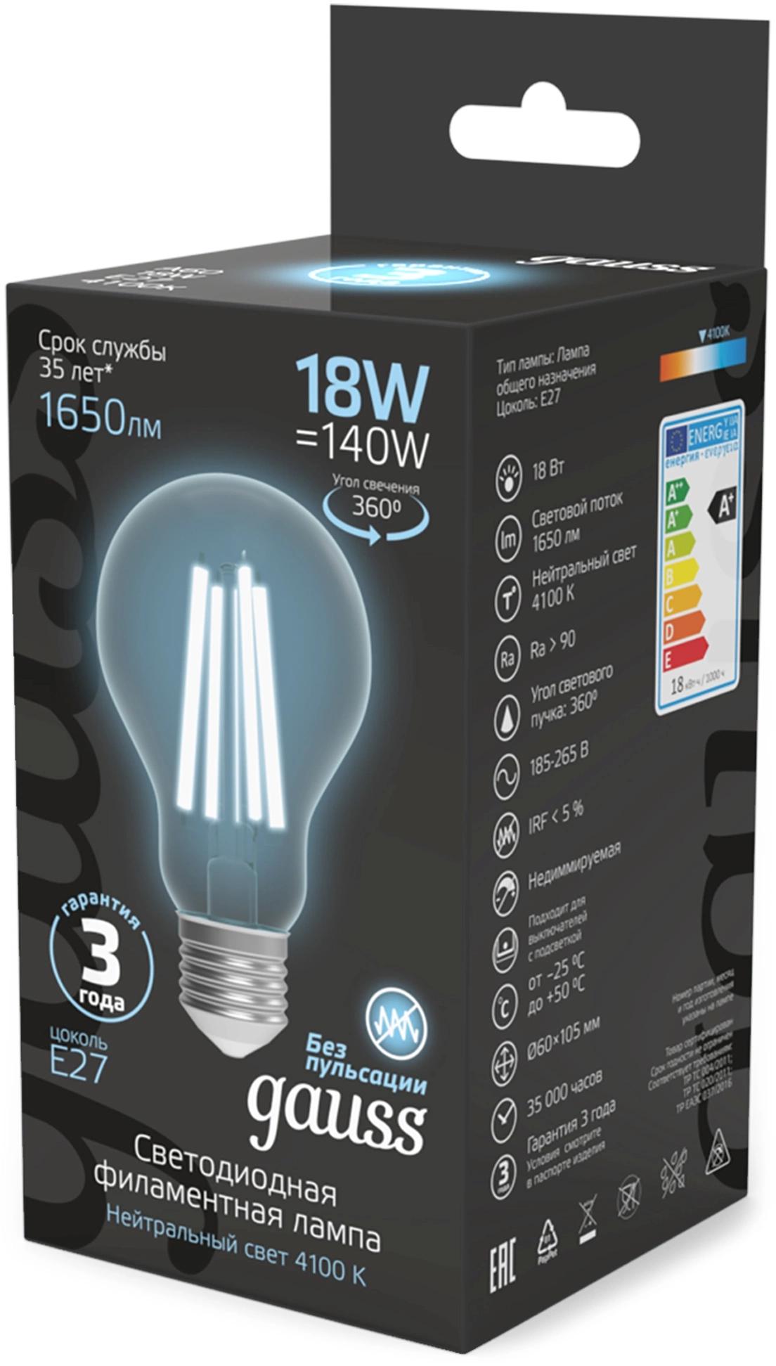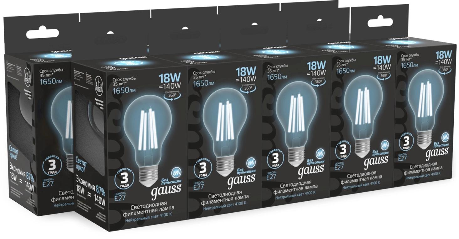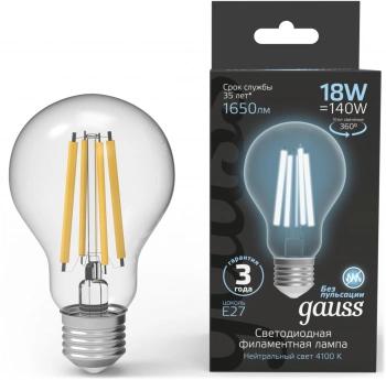 Лампа филам. Gauss Filament 18Вт цок.:E27 груша 220B св.свеч.бел.нейт. (упак.:10шт) (102902218)