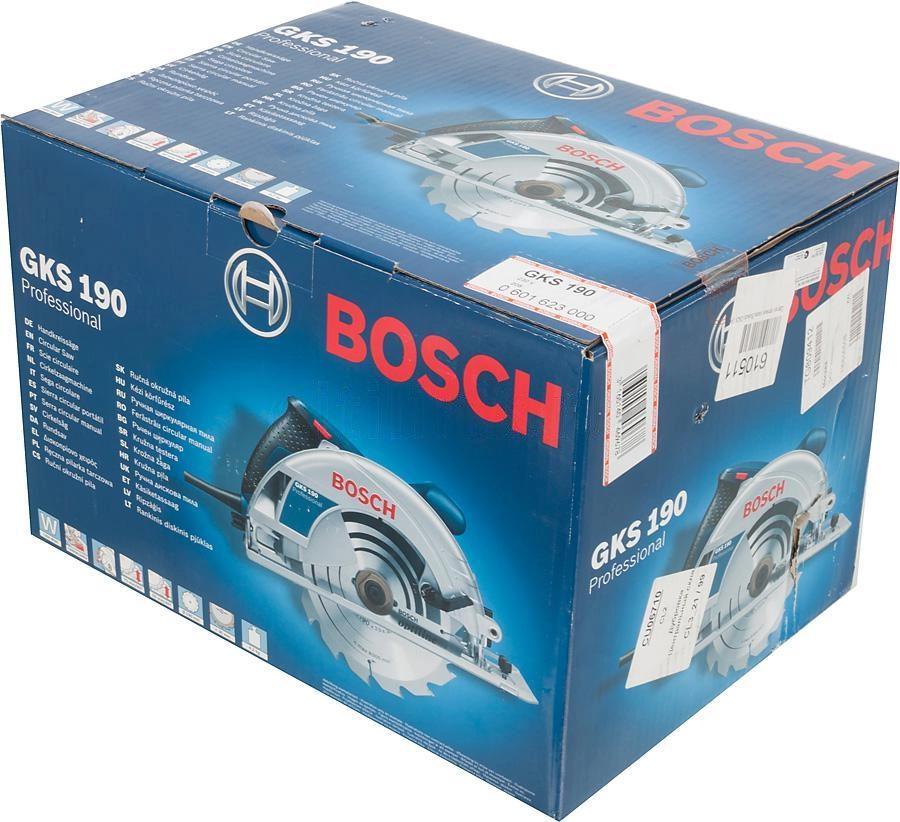 Дисковая пила Bosch GKS 190, твердосплавный пильный диск, Optiline Wood, 190x30x2 мм, шестигранный торцовый ключ 5, параллельный упор, переходник пылеотвода, руководство по эксплуатации Bosch GKS 190, коробка.