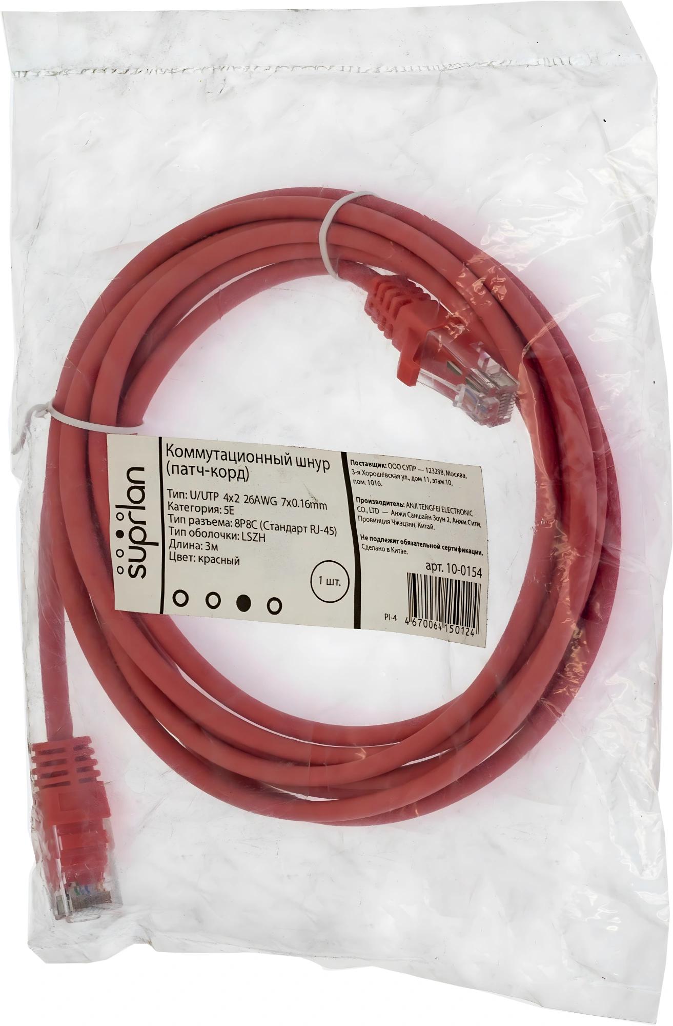 Патч-корд Suprlan 10-0154 UTP RJ-45 вил.-вилка RJ-45 кат.5E 3м красный LSZH 26AWG