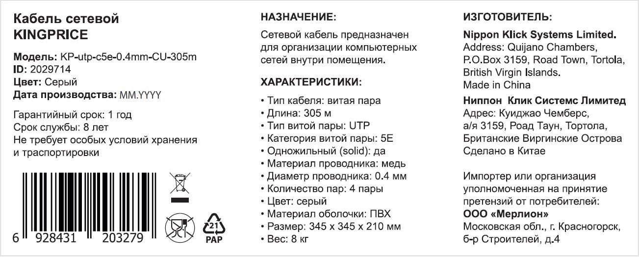 Кабель сетевой KingPrice KP-utp-c5e-0.4mm-CU-305m UTP 4 пары cat.5E solid 0.40мм Cu 305м серый