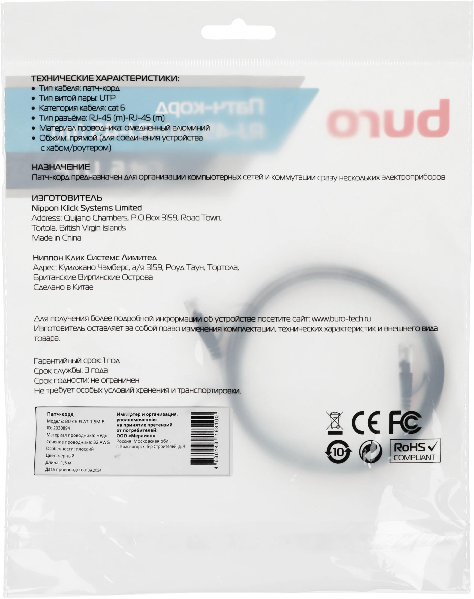 Патч-корд Buro Flat 10Гбит/с UTP 4 пары cat.6 Cu molded 1.5м черный RJ-45 (m)-RJ-45 (m) (BU-С6-FLAT-1.5M-B)