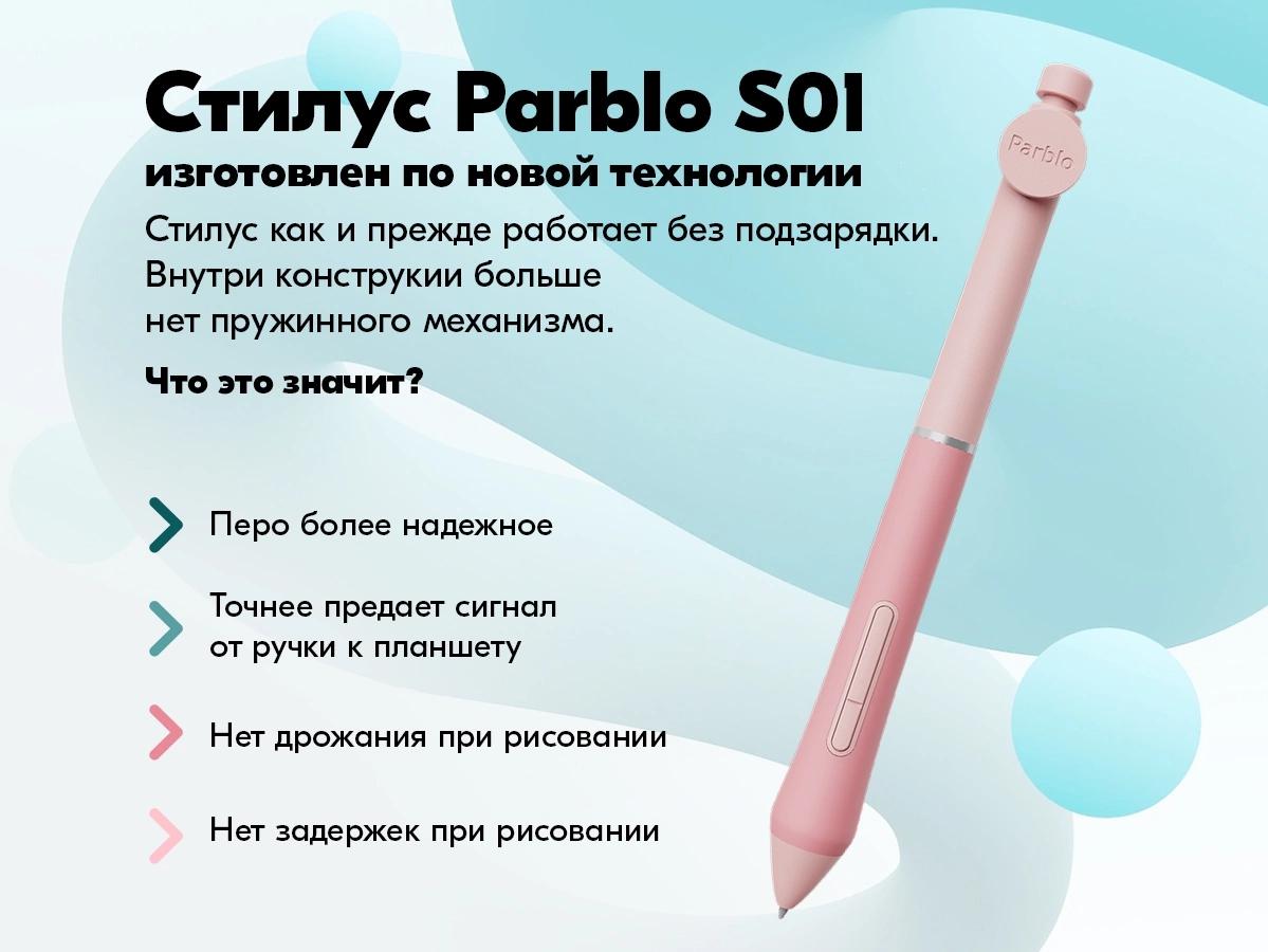 Новый стилус S01. Его особенности: полностью устранен джиттер эффект (эффект подрагивания курсора) при рисовании. Изменена конструкция фиксирования наконечника пера - теперь наконечник неподвижен, это точнее передает нажим пера.Программируемое Dial-кольцо.Физический переключатель режимов планшета.