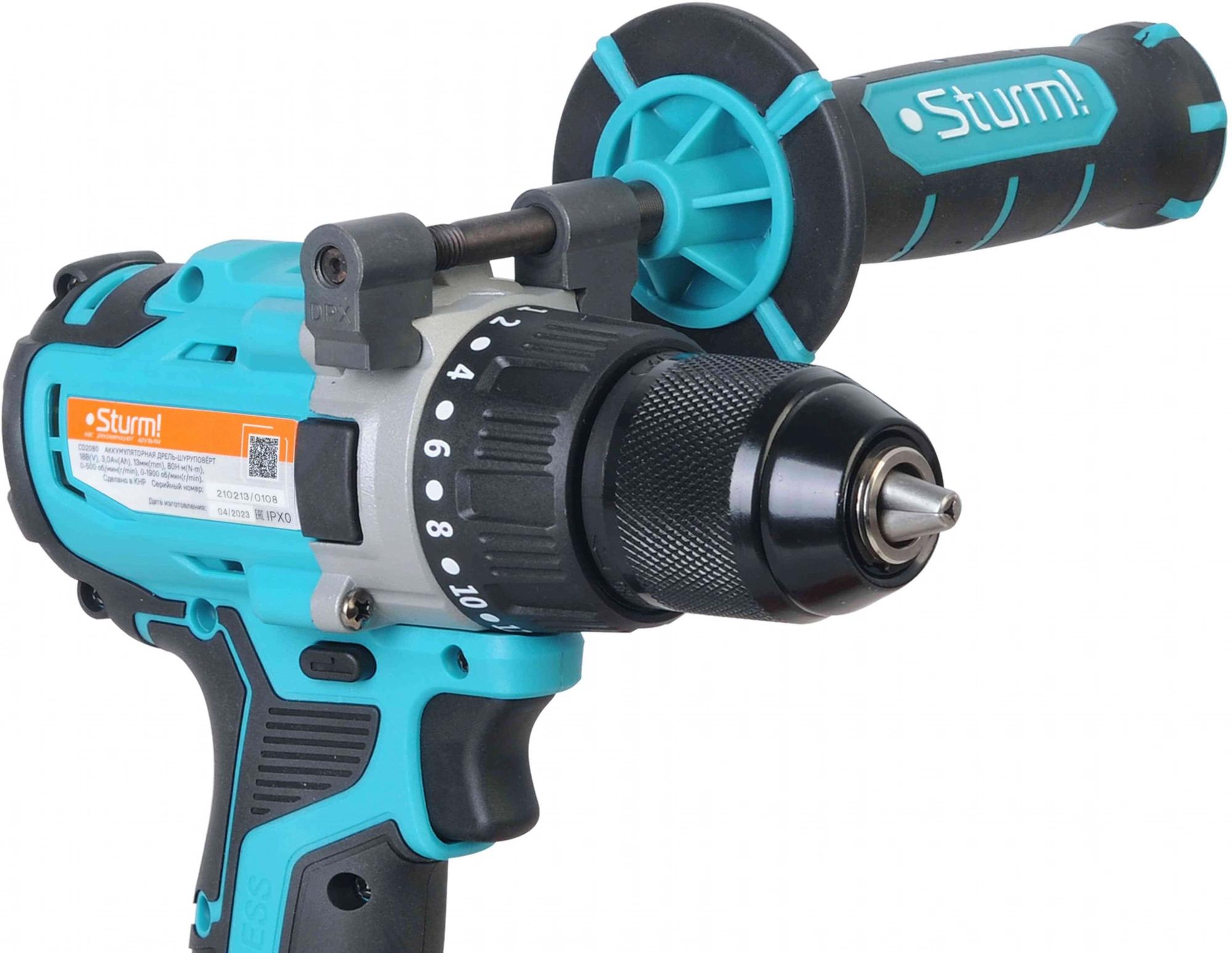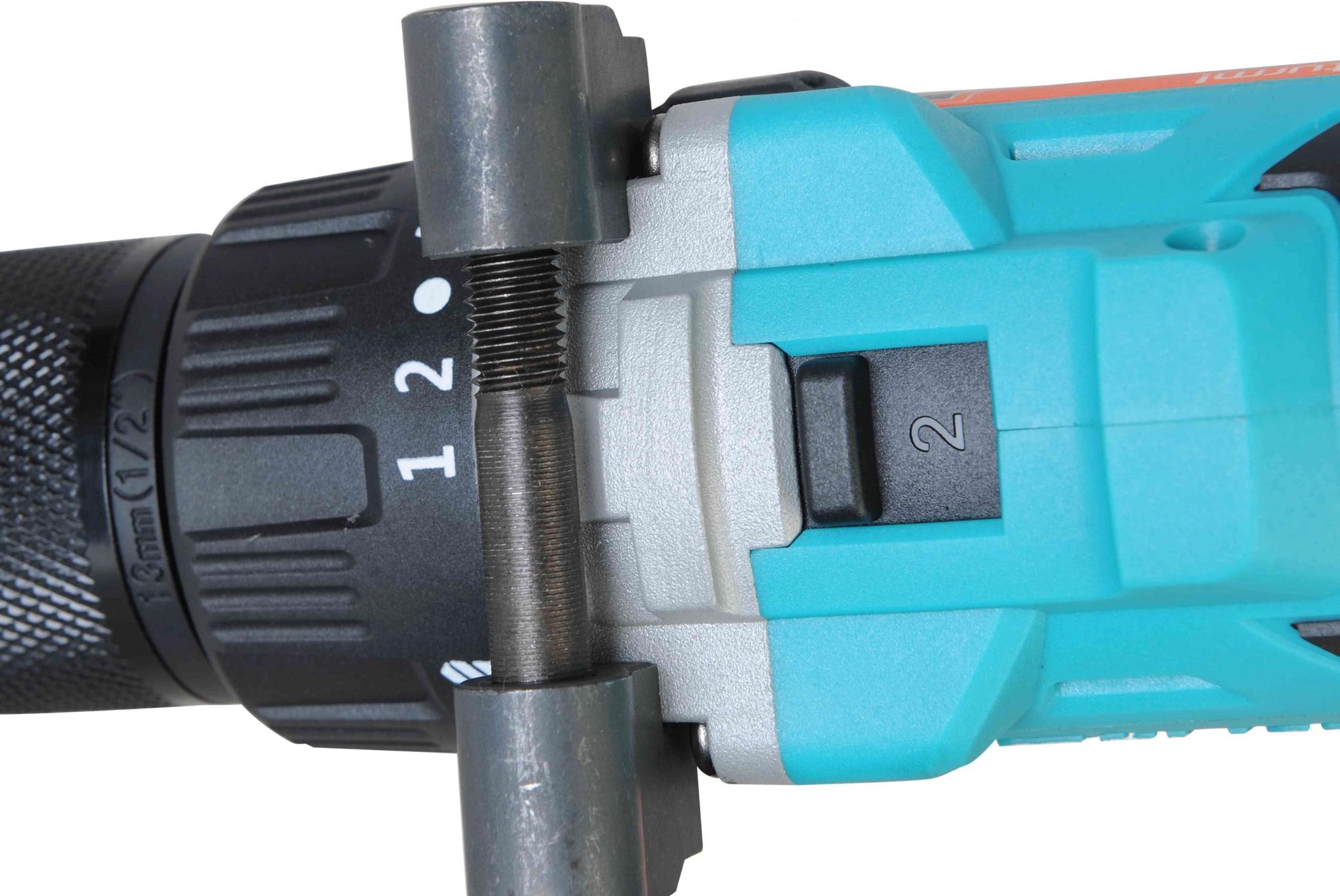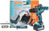 Дрель-шуруповерт аккумуляторная, аккумуляторная батарея (2 шт, одна подсоединена к шуруповерту), зарядное устройство, двойная бита, дополнительная рукоятка, инструкция по эксплуатации, инструкция по безопасности, кейс.