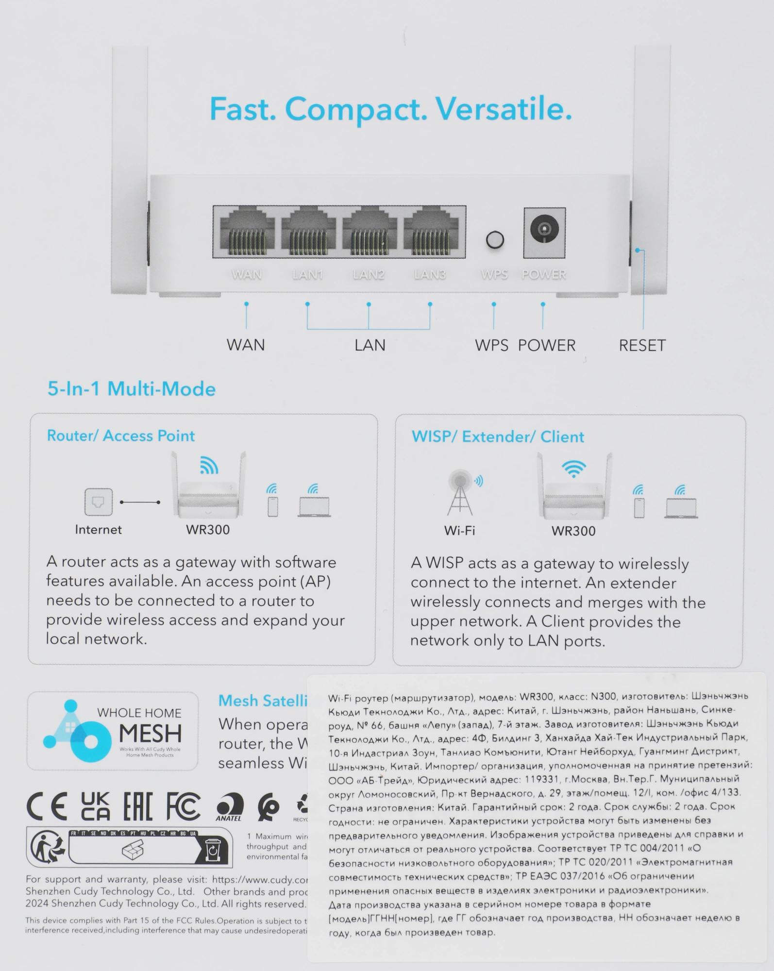 Wi-Fi роутер, адаптер питания, RJ45 Ethernet кабель, руководство быстрой установки.