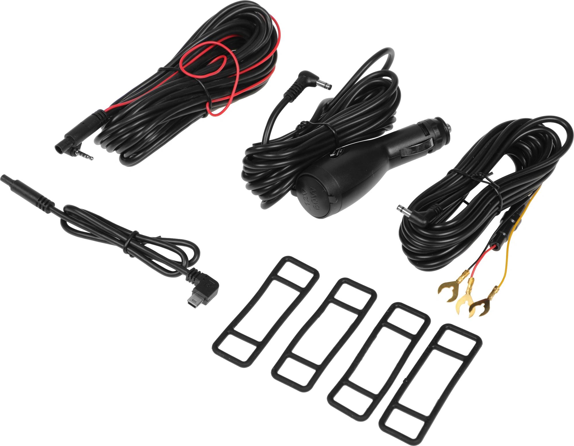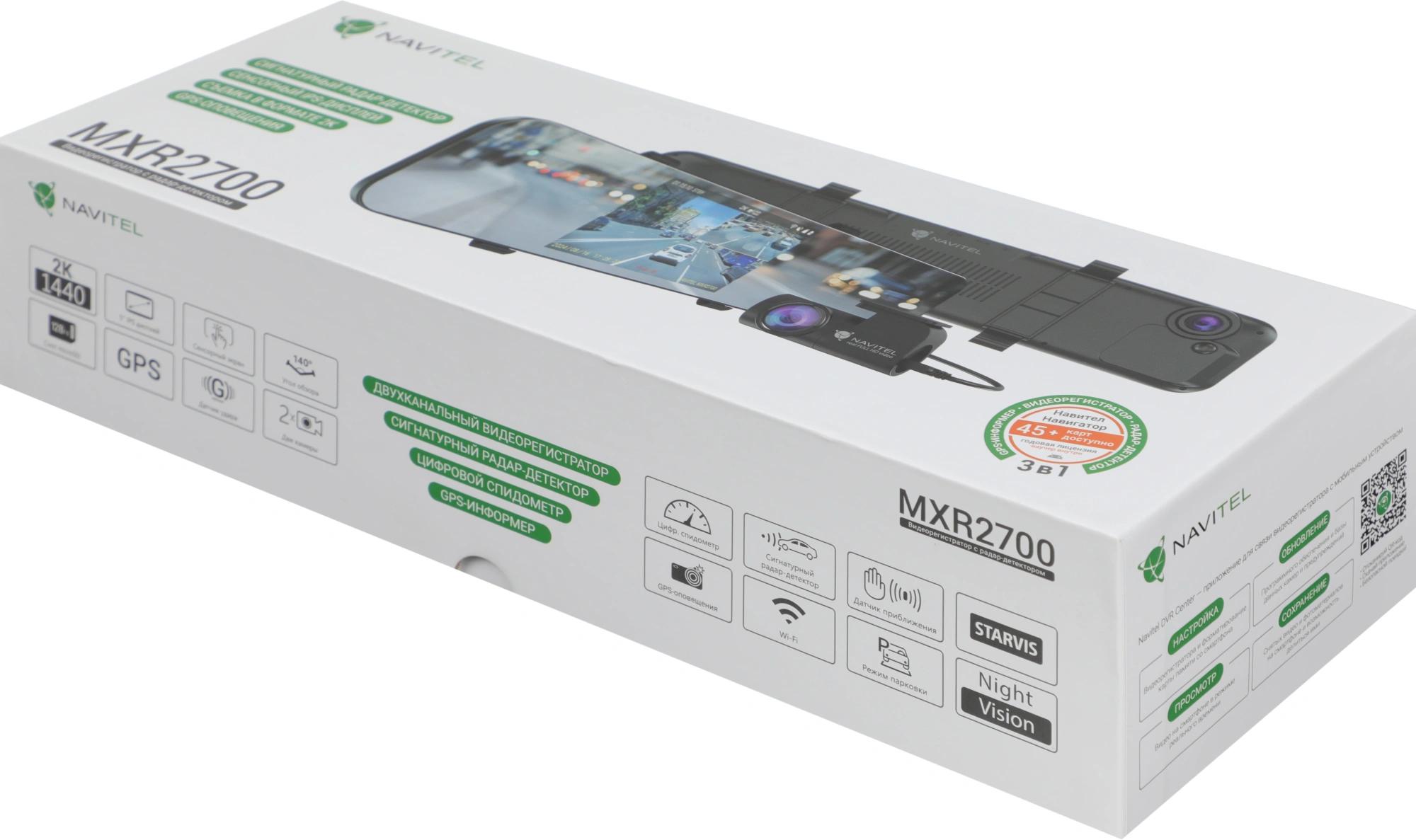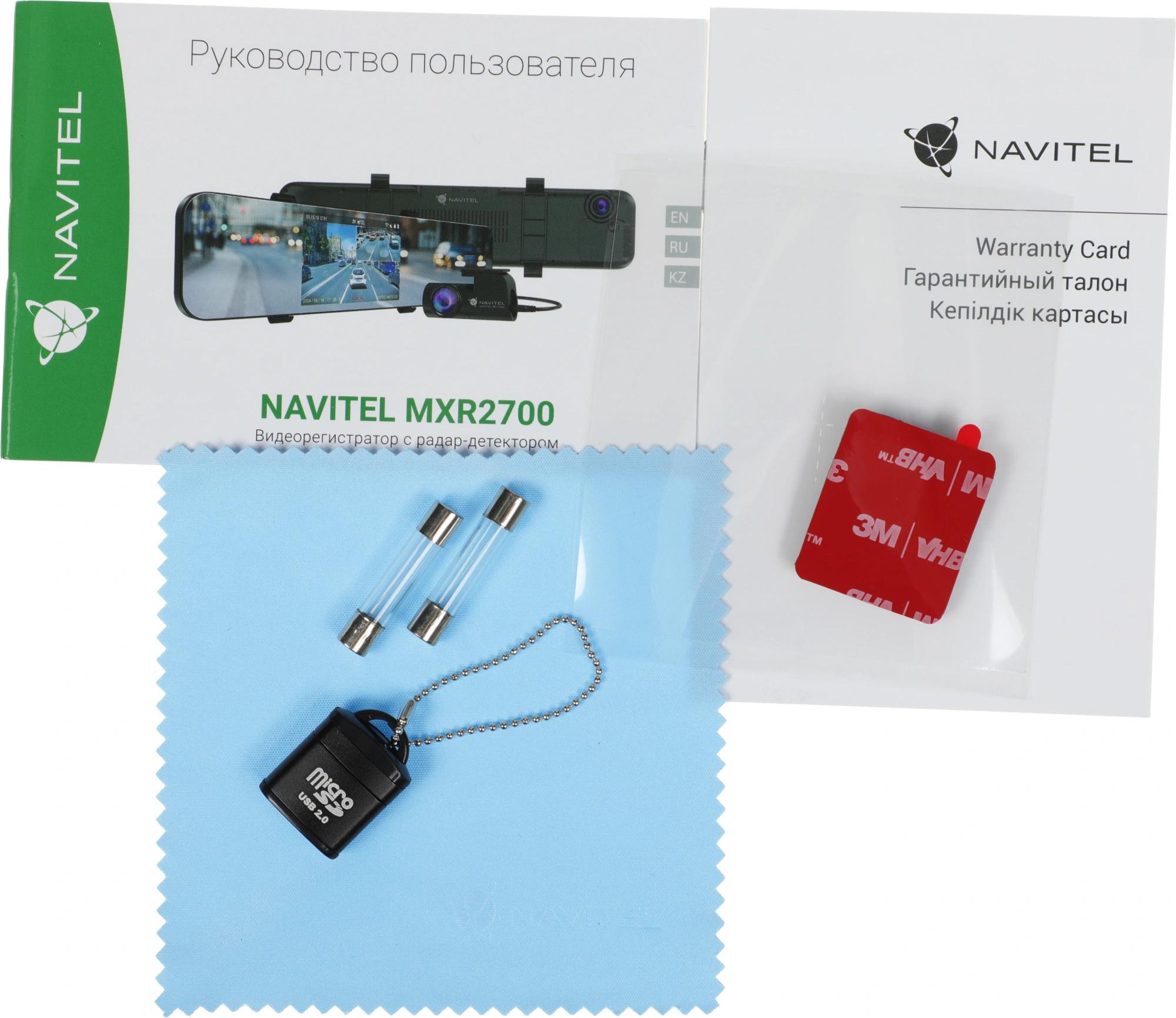 Видеорегистратор NAVITEL MXR2700, электростатическая пленка, автомобильное зарядное устройство 12 В со сквозным питанием, 2 предохранителя, кабель для скрытой установки длиной 400 см., камера заднего вида, кабель для подключения камеры заднего вида, картридер, салфетка из микрофибры, инструкция.