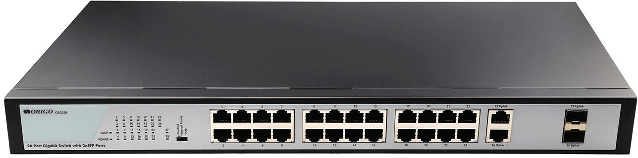 Коммутатор OS2228, кабель питания, комплект для установки в 19-дюймовую стойку, краткое руководство по установке.