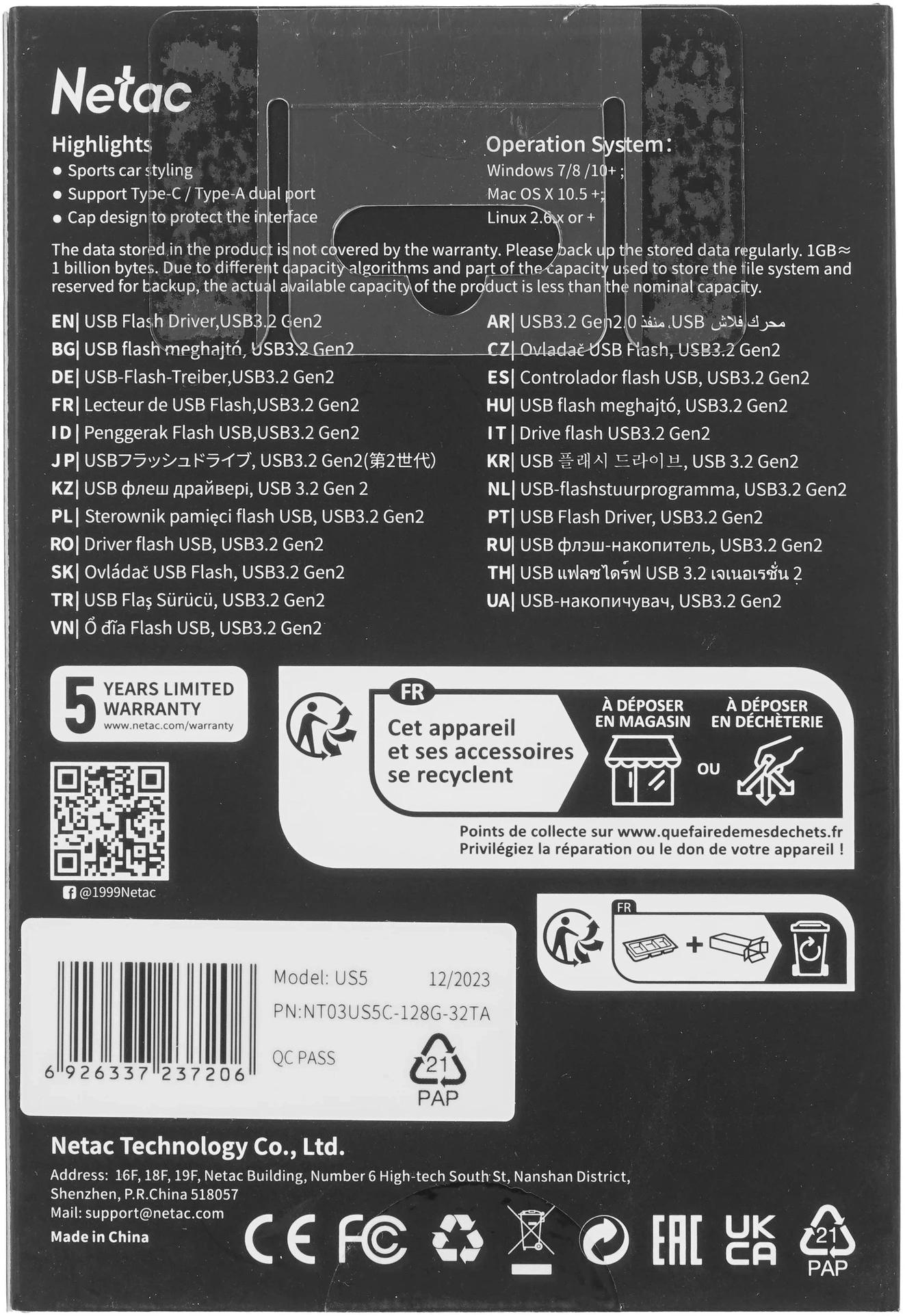 Флеш Диск Netac 128GB US5 NT03US5C-128G-32TA USB3.2 серый