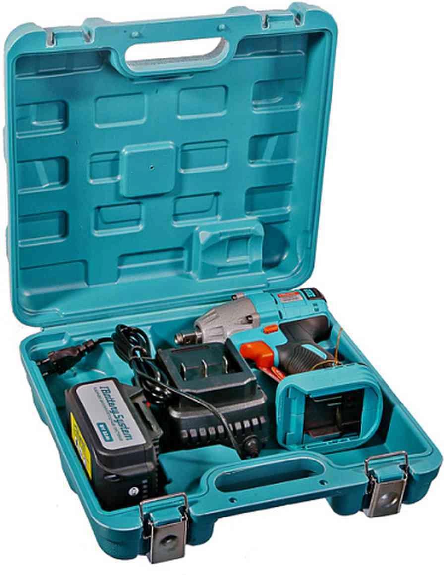Гайковерт аккумуляторный, аккумуляторная батарея, зарядное устройство, пластиковый кейс, инструкция по эксплуатации.