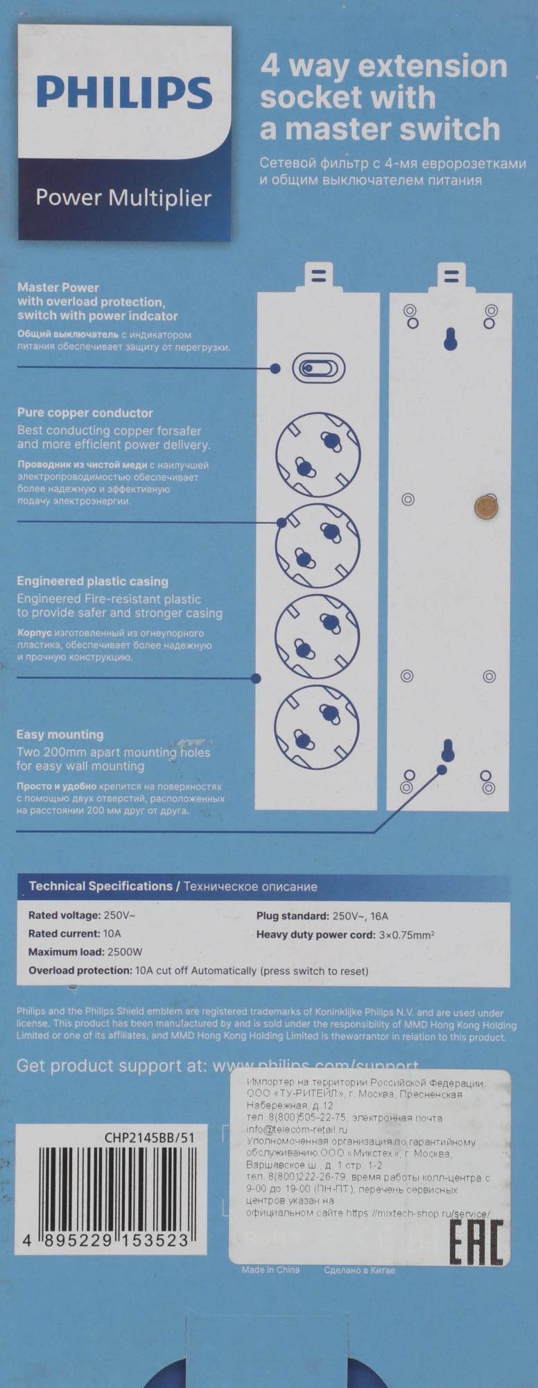 Сетевой фильтр Philips CHP2145BB/51 3м (4 розетки) черный (коробка)