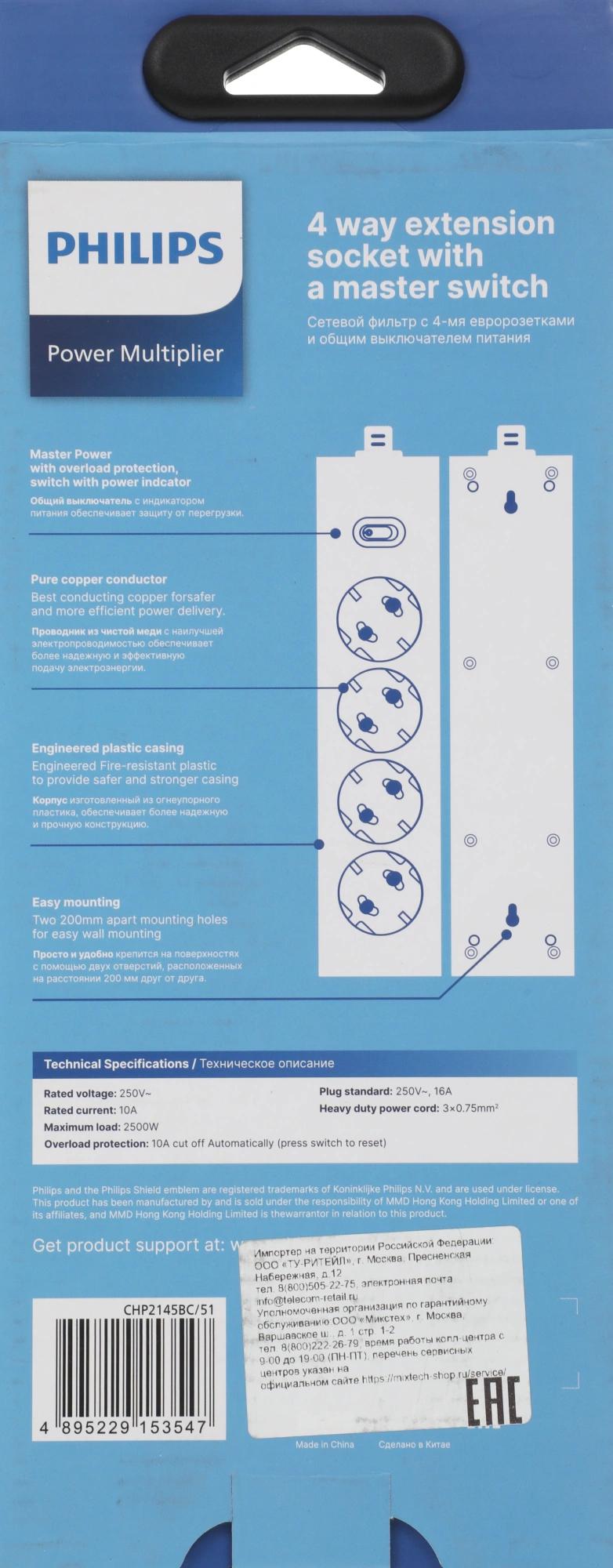 Сетевой фильтр Philips CHP2145BC/51 5м (4 розетки) черный (коробка)