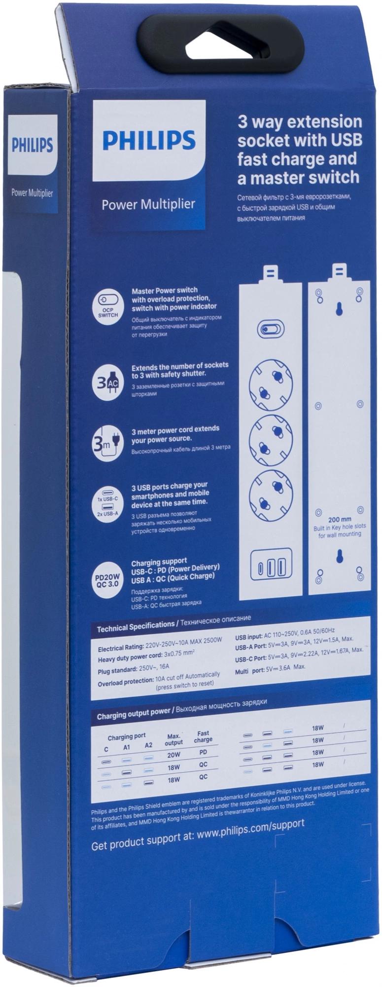 Сетевой фильтр Philips CHP4336BB/51 3м (3 розетки) черный (коробка)