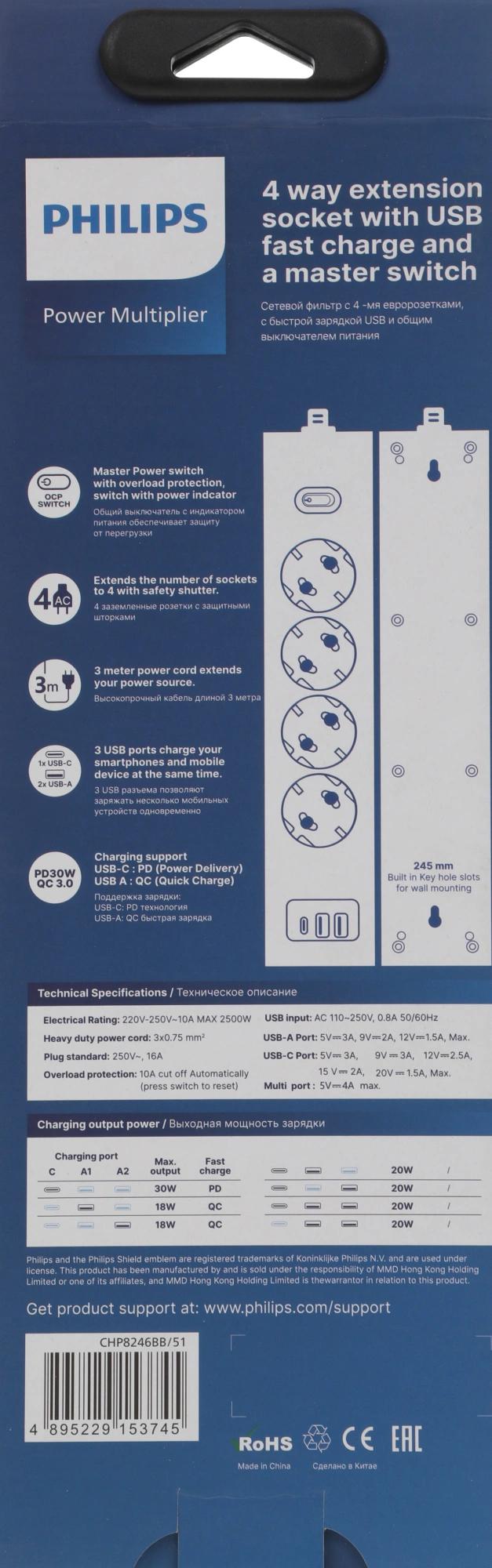 Сетевой фильтр Philips CHP8246BB/51 3м (4 розетки) черный (коробка)
