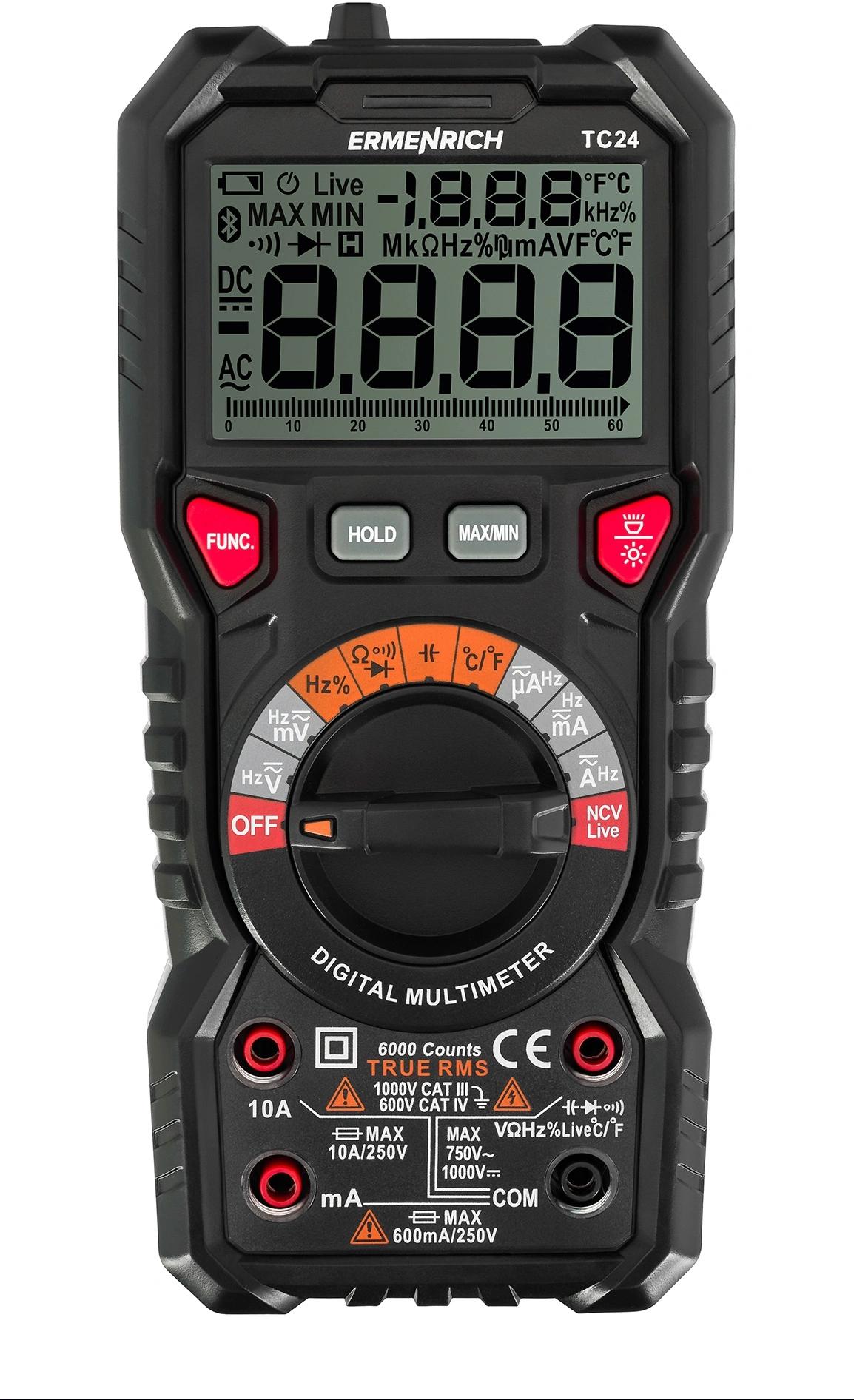 Функции: вольтметр, амперметр, омметр, фарадометр, частотомер, измеритель рабочего цикла, термопара, прозвонка, тест диодов, NCV, детектор фазы. Автоматический выбор предела измерения