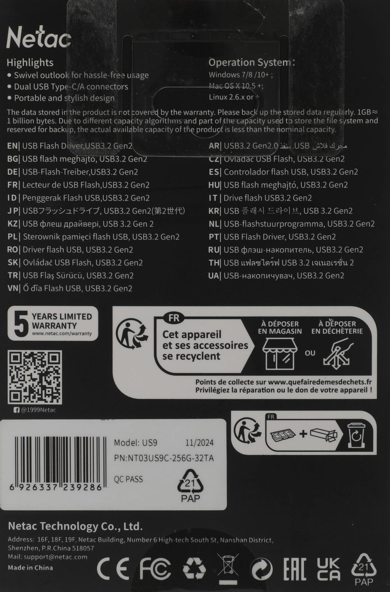 Флеш Диск Netac 256GB US9 NT03US9C-256G-32TA USB3.2 серый