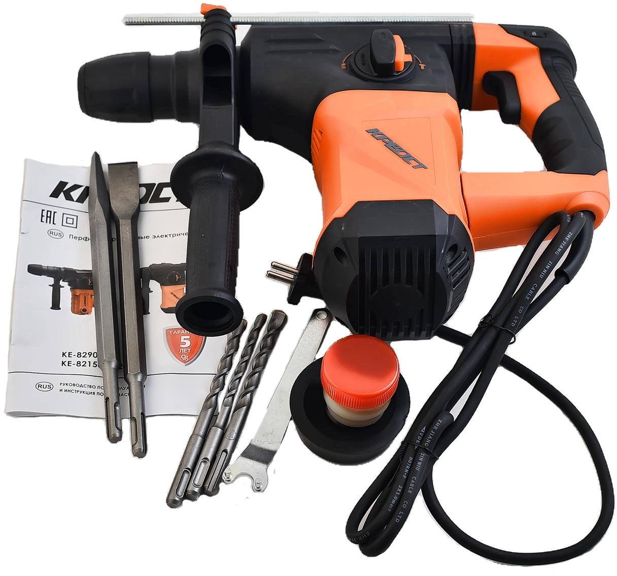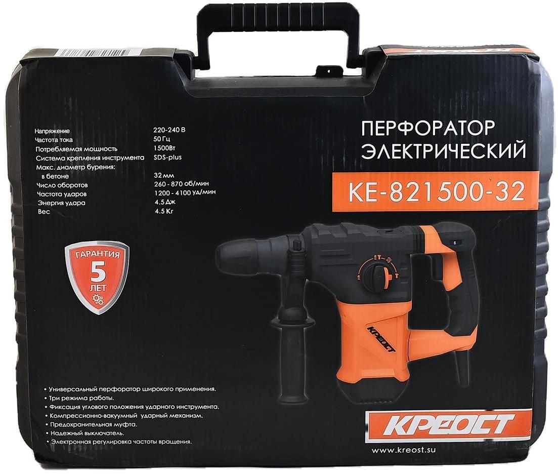 Электрический перфоратор Креост KE-821500-32 питается от сети. Имеет ограничитель глубины сверления и D-образную рукоятку. Устройство предназначено для работ по дереву, бетону и металлу. Модель поддерживает три режима работы: долбление, сверление и сверление с ударом.