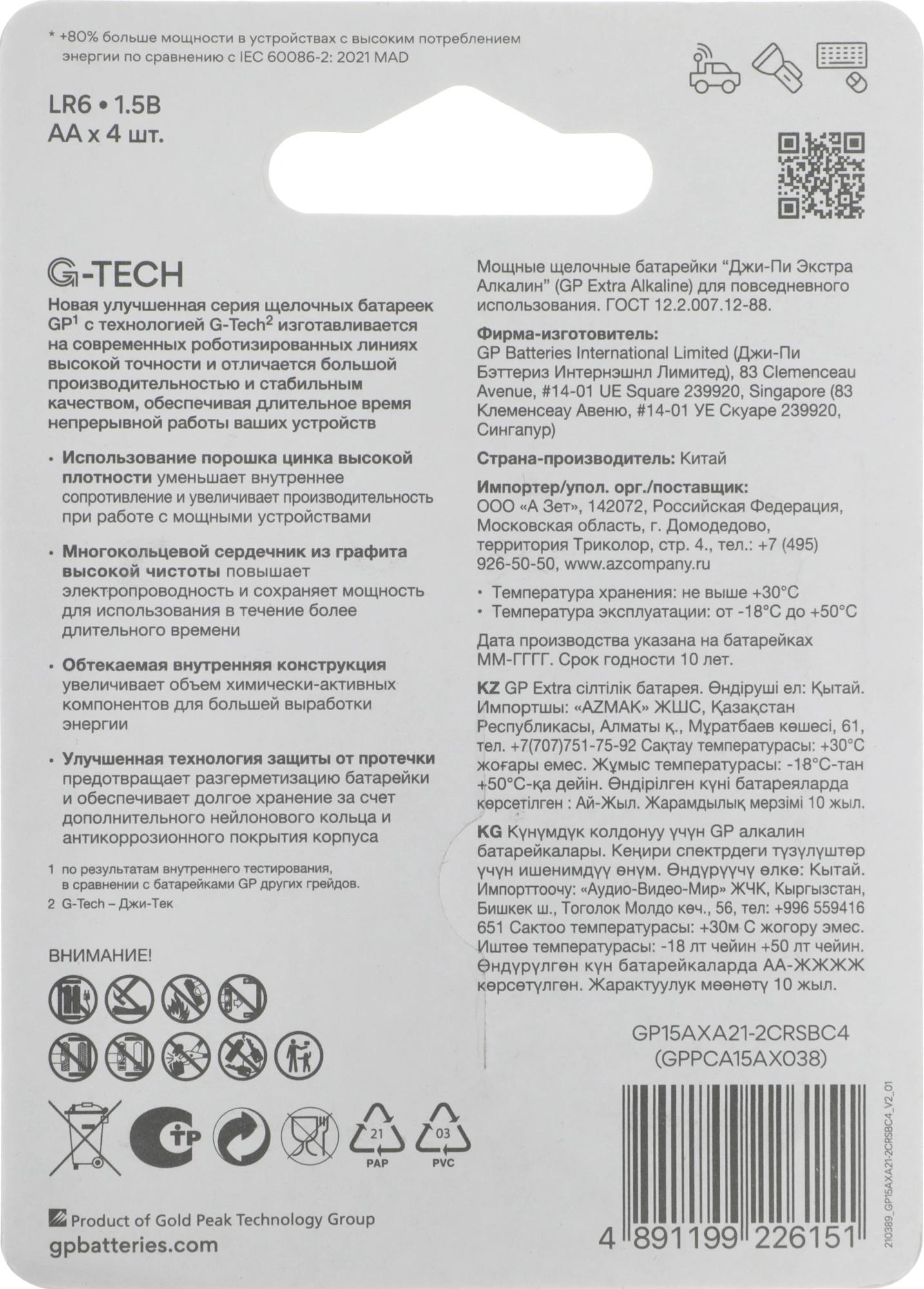 Батарея GP Extra Alkaline 15AXA21-2CRSBC4 AA (4шт) блистер
