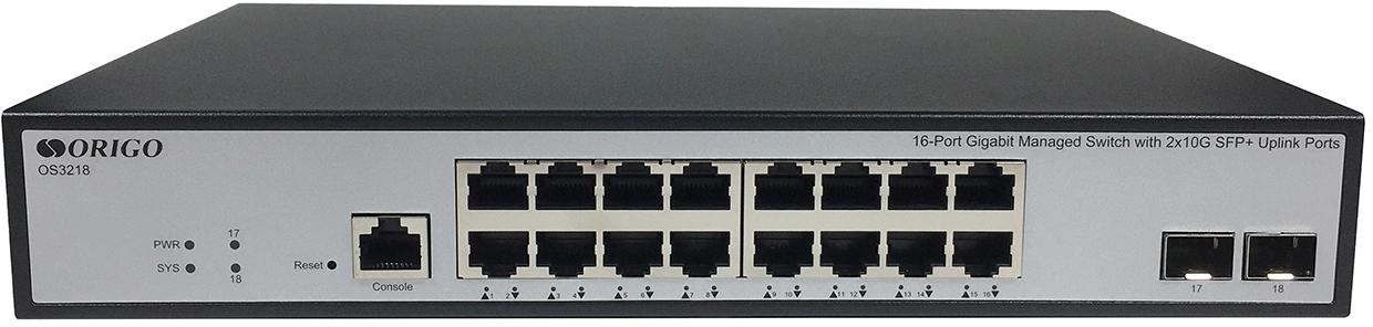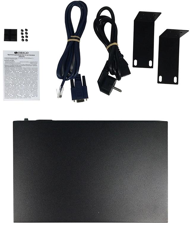 Коммутатор OS3218, кабель питания, консольный кабель с разъемом RJ-45, комплект для установки в 19-дюймовую стойку, краткое руководство по установке.