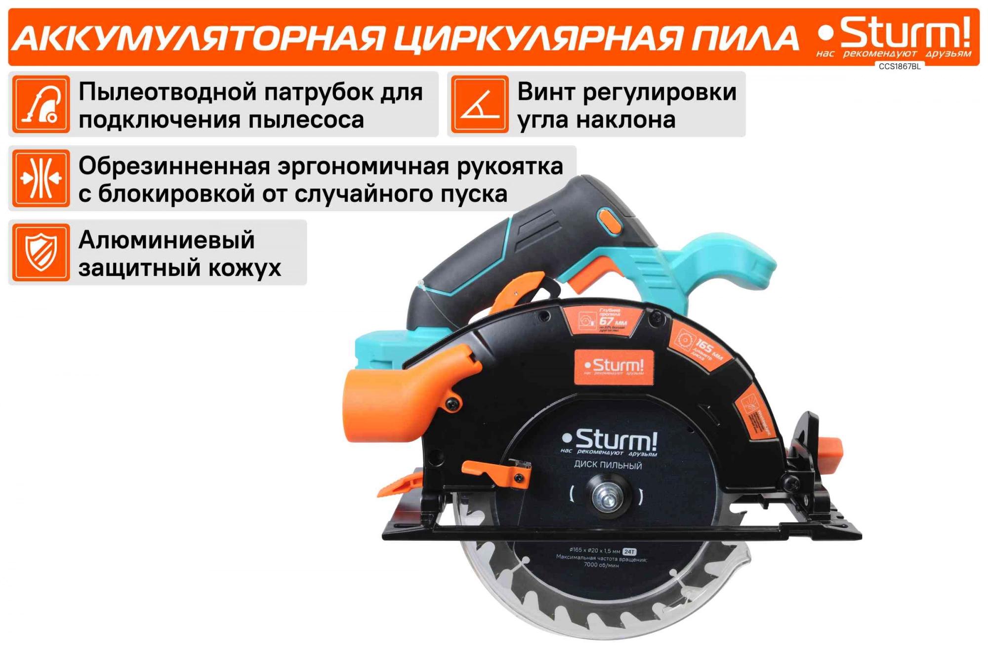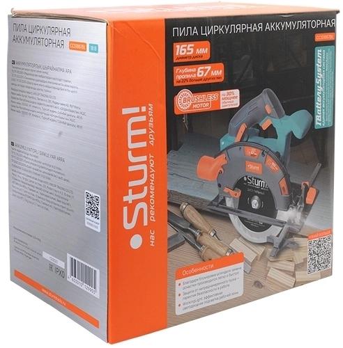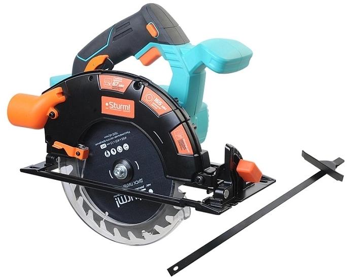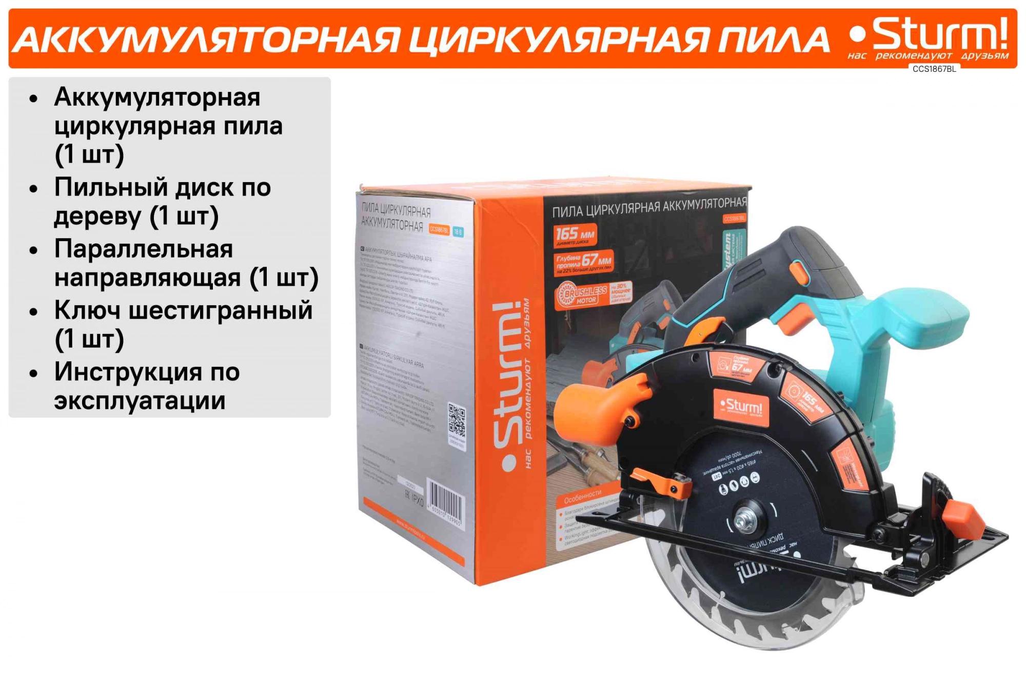 Аккумуляторная циркулярная пила, пильный диск по дереву, параллельная направляющая, ключ шестигранный, инструкция по безопасности, инструкция по эксплуатации.