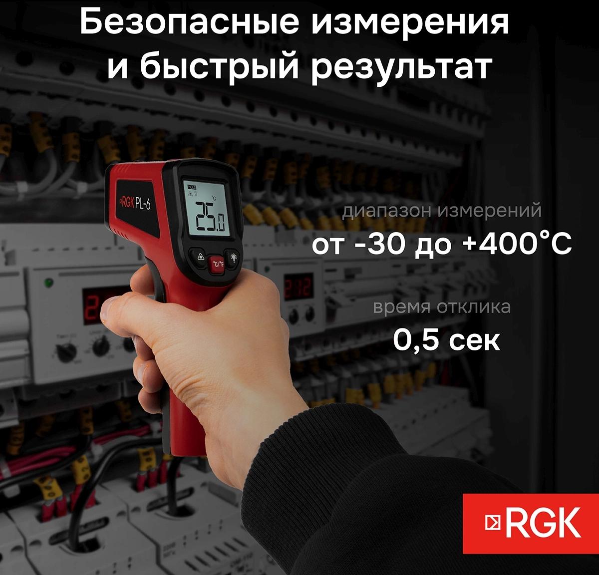 Инфракрасный пирометр RGK PL-6, батарейки AAA 1, 5В - 2 шт., руководство по эксплуатации.