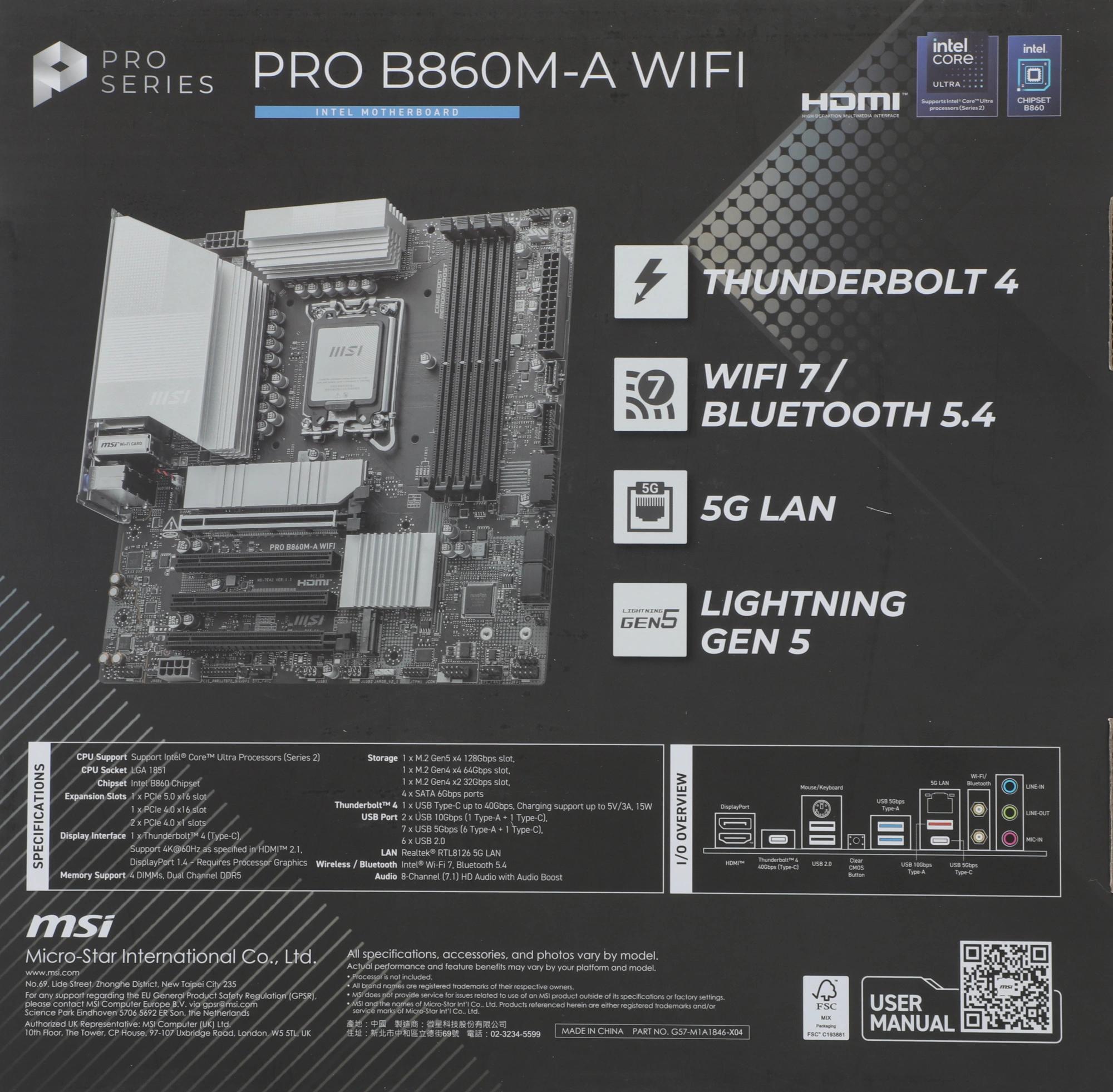Материнская плата MSI PRO B860M-A WIFI Soc-1851 Intel B860 4xDDR5 mATX AC`97 8ch(7.1) 5Gigabit RAID+HDMI+DP