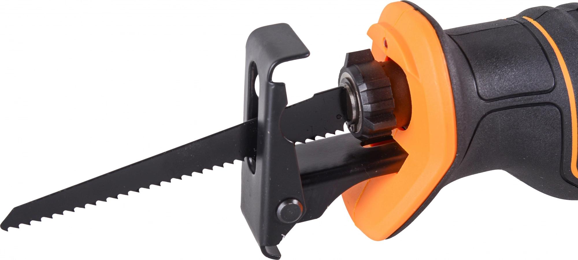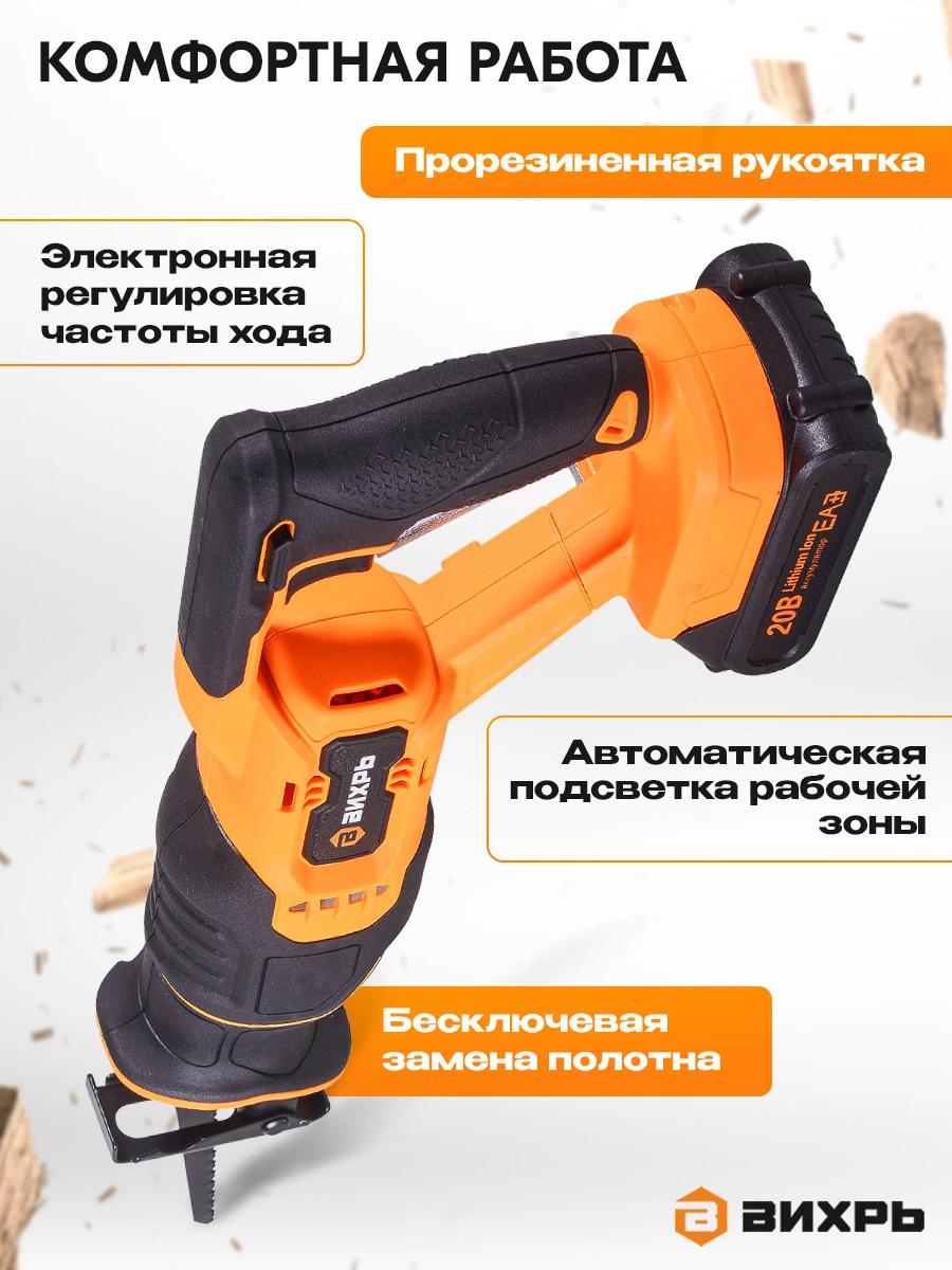 Сабельная пила, аккумуляторная батарея, адаптер питания (зарядное устройство), пилка по дереву, шестигранный ключ, паспорт, упаковка.