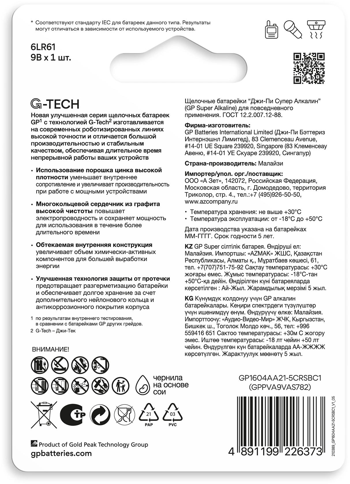 Батарея GP Super Alkaline 1604AA21-5CRSBC1 9V (1шт) блистер