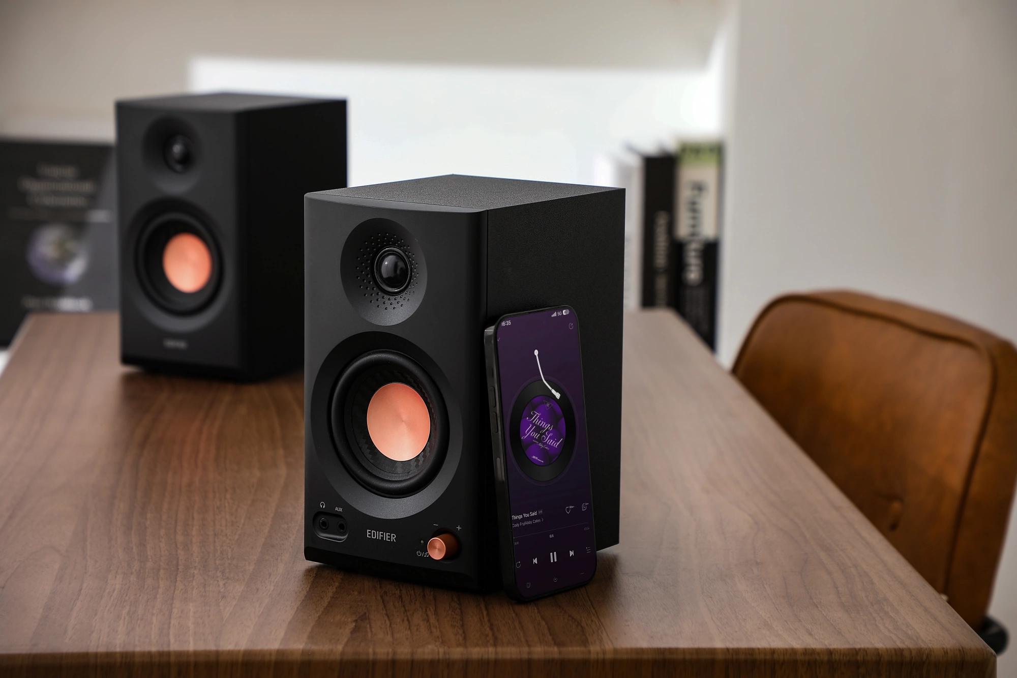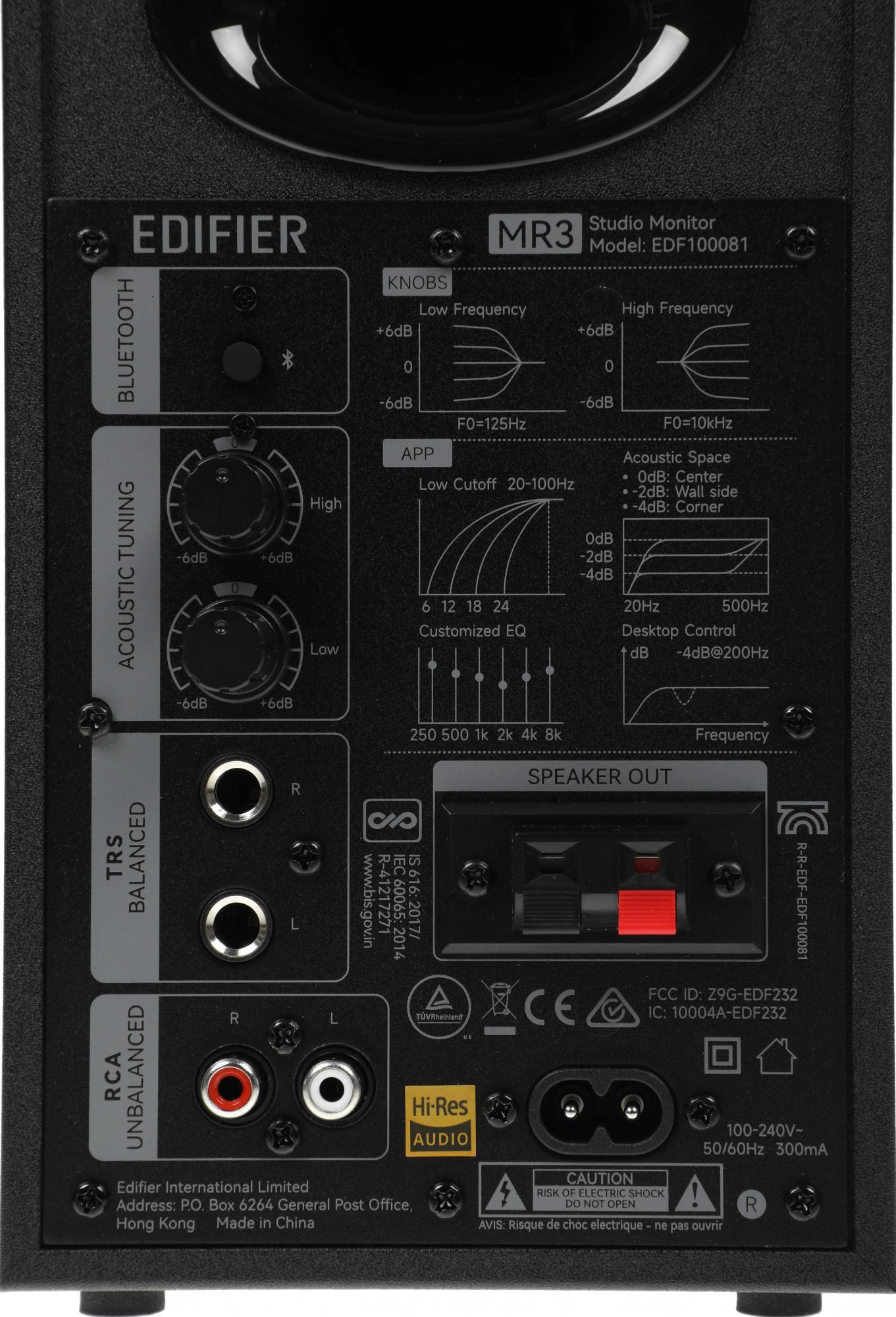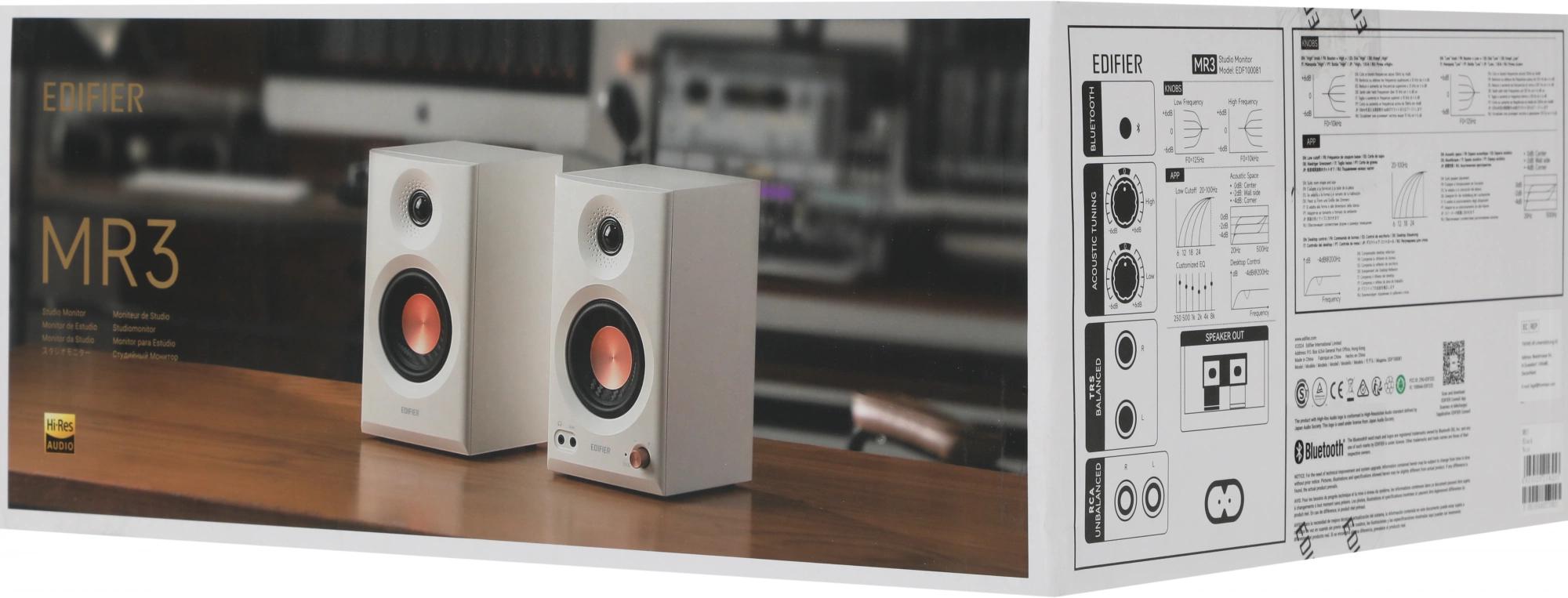Плоская АЧХ. Сертификация Hi-Res Audio. Несколько вариантов акустической настройки. Корпус из МДФ. 3, 5-дюймовые средне-низкочастотные динамики и 1-дюймовые шелковые купольные твитеры. Обработка звука с высоким разрешением 24 бит / 96 кГц. Работает с мобильным приложением EDIFIER ConneX