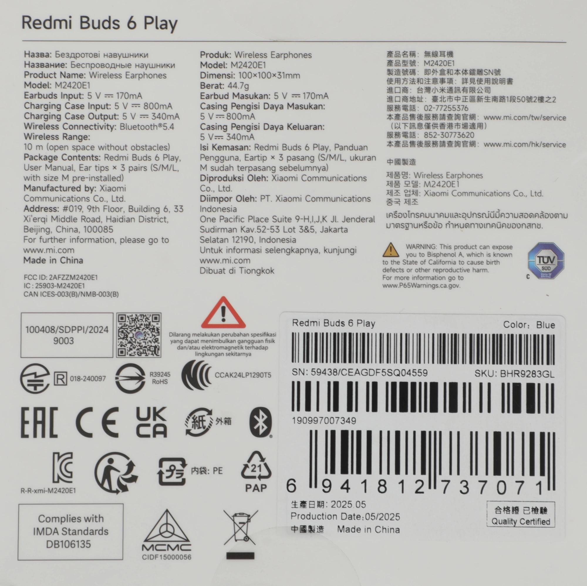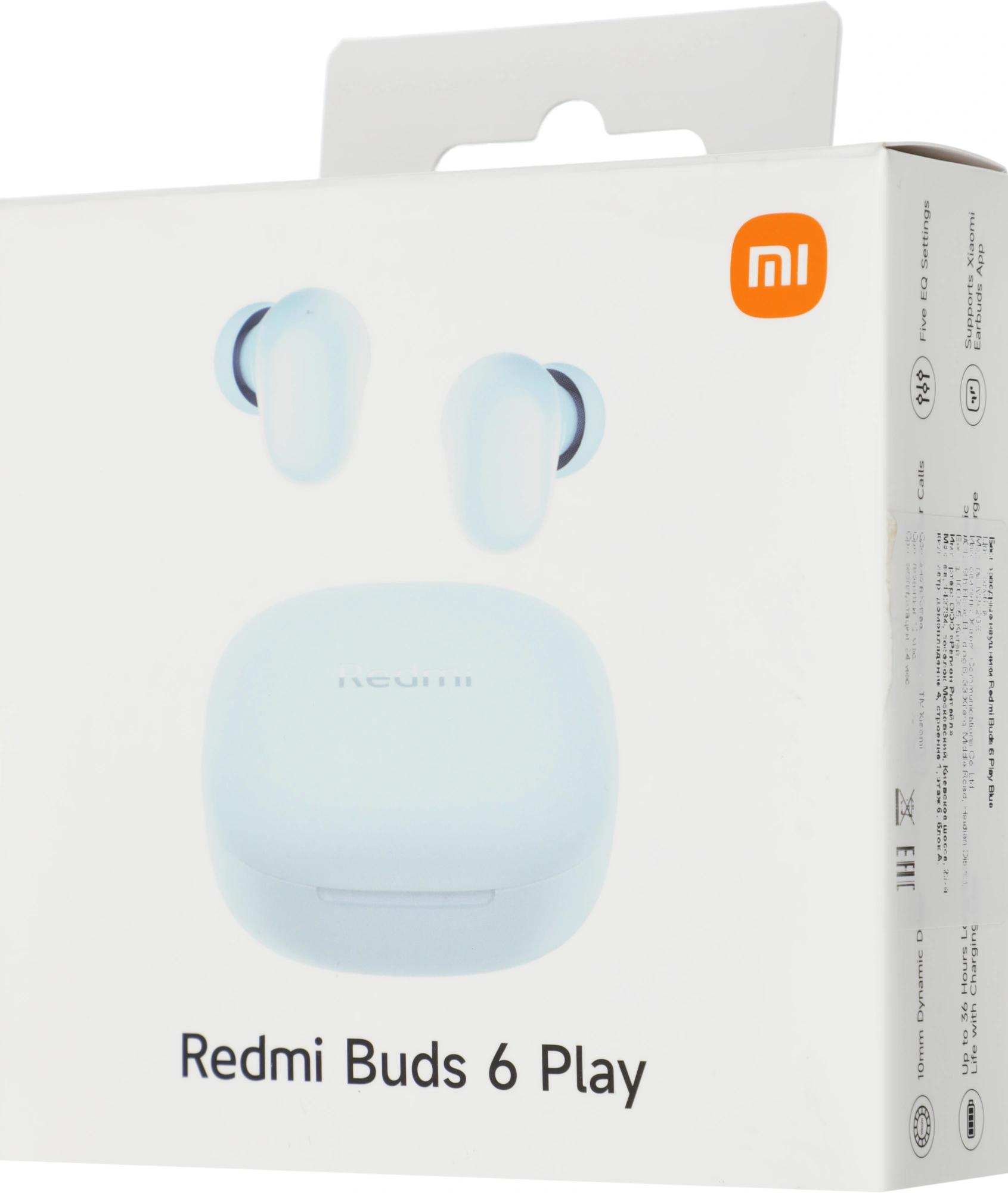 Гарнитура внутриканальные Xiaomi Redmi Buds 6 Play синий беспроводные bluetooth в ушной раковине (BHR9283GL)