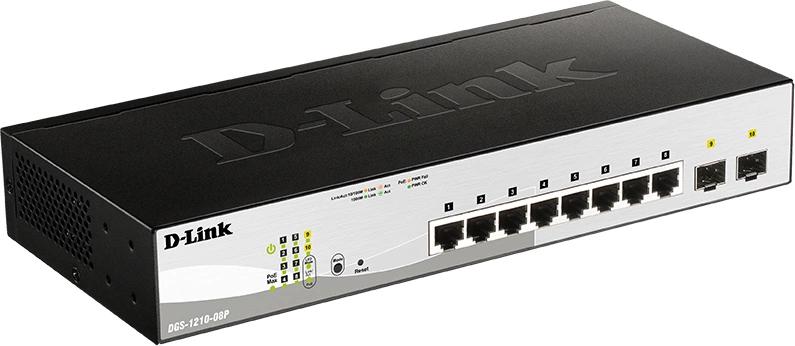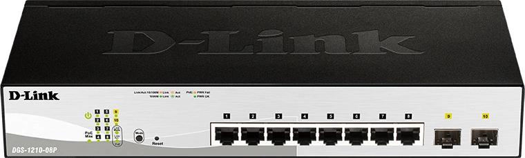Коммутатор DGS-1210-08P, адаптер питания, 2 крепежных кронштейна для установки в 19-дюймовую стойку, 4 резиновые ножки, комплект для монтажа, краткое руководство по установке.