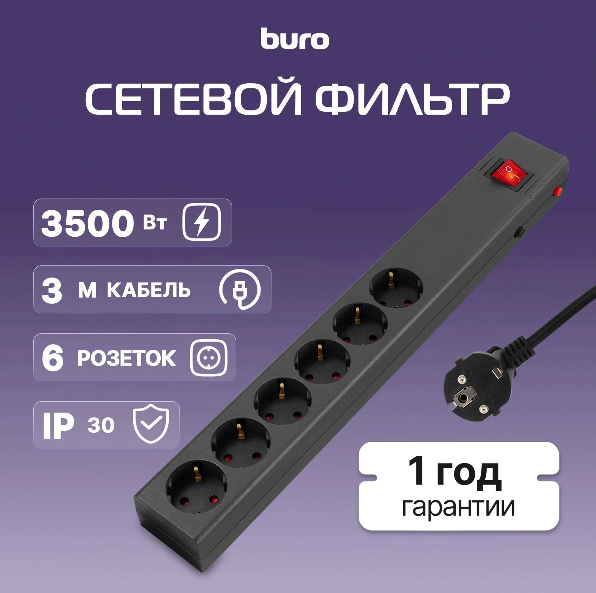 Сетевой фильтр Buro 600SE-16-3-B 3м (6 розеток) черный (коробка)
