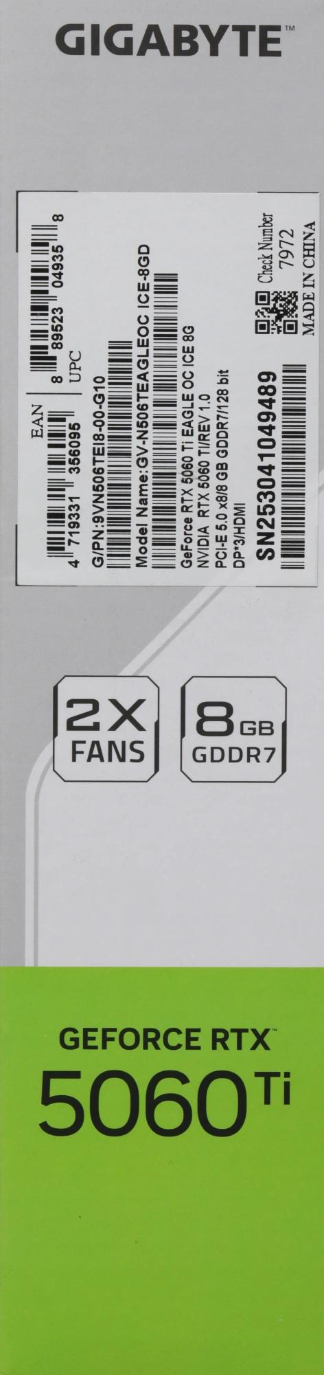 Видеокарта Gigabyte PCI-E 5.0 GV-N506TEAGLEOC ICE-8GD 1.0 NVIDIA GeForce RTX 5060TI 8Gb 128bit GDDR7 2572/28000 HDMIx1 DPx3 HDCP Ret
