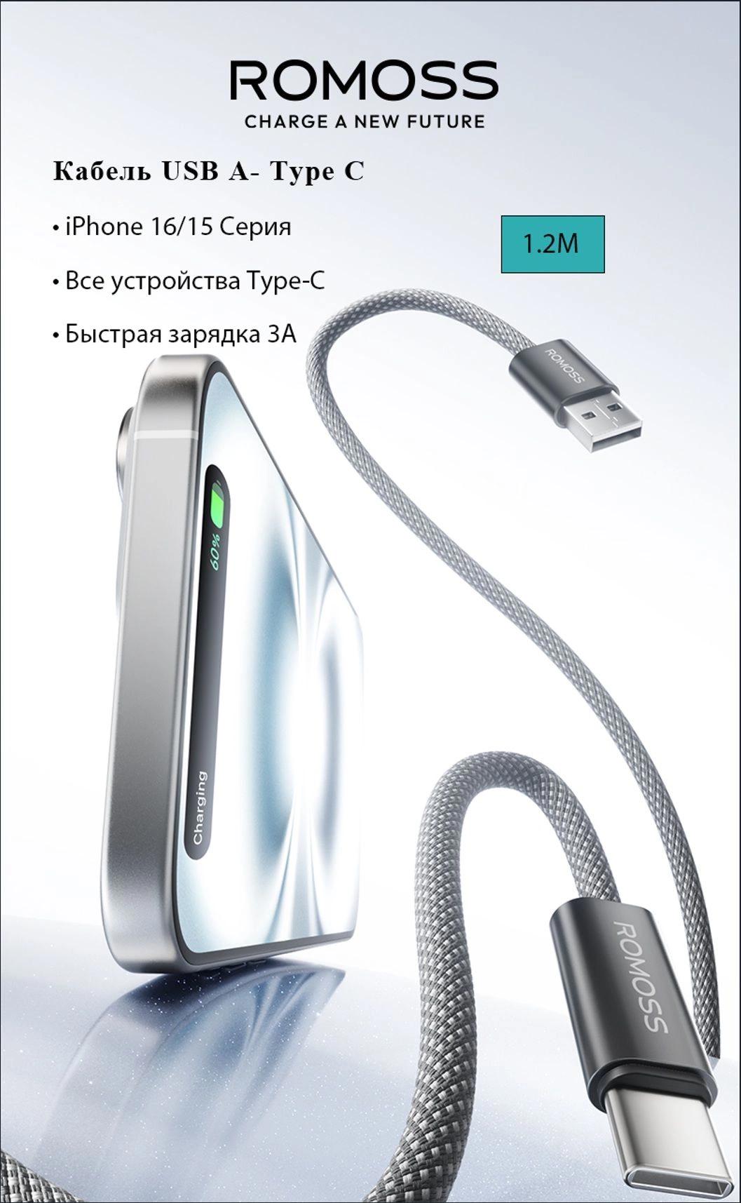 Кабель Romoss CB3038 6958377525951 ver2.0 USB (m)-USB Type-C (m) 1.2м черный
