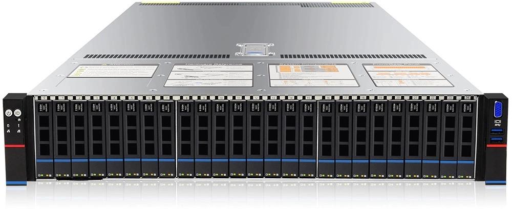 Корзина на 24 диска NVME 2.5. Диски подключены напрямую к материнской плате. Тыловая корзина на 2 системных диска SATA 2.5. Установлена карта LREC9804BT. Рельсы в комплекте.