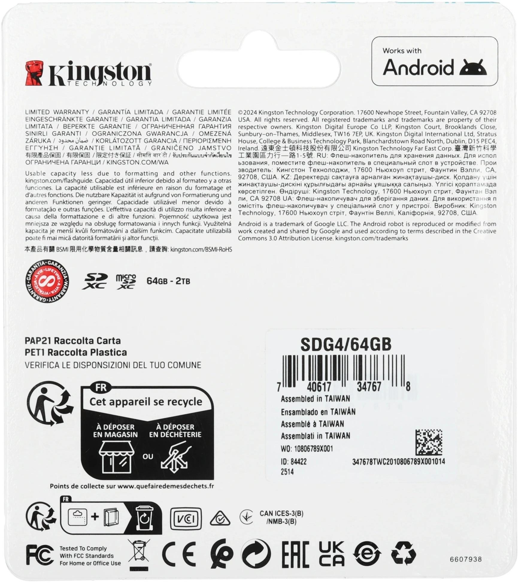 Флеш карта SDXC 64GB Kingston SDG4/64GB Canvas Go! Plus V30 w/o adapter