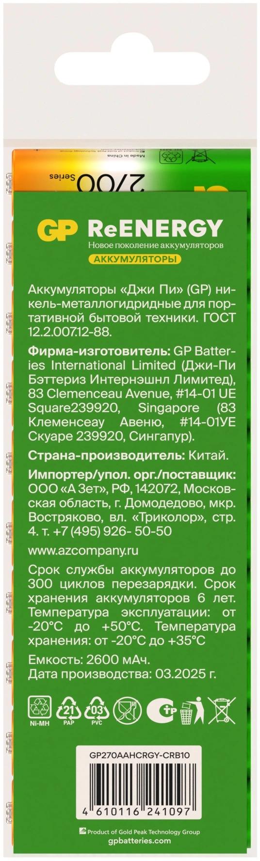 Аккумулятор GP 270AAHCRGY-CRB10 AA NiMH 2700mAh (10шт) спайка