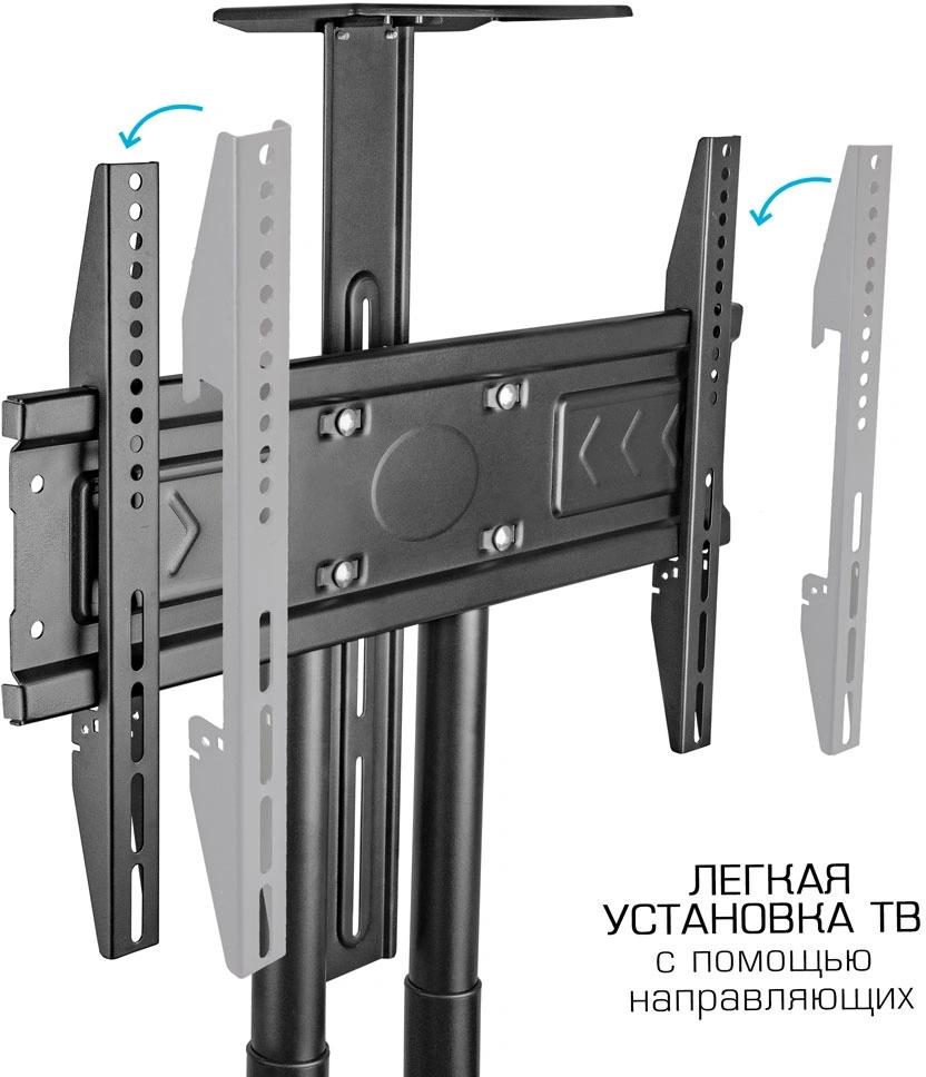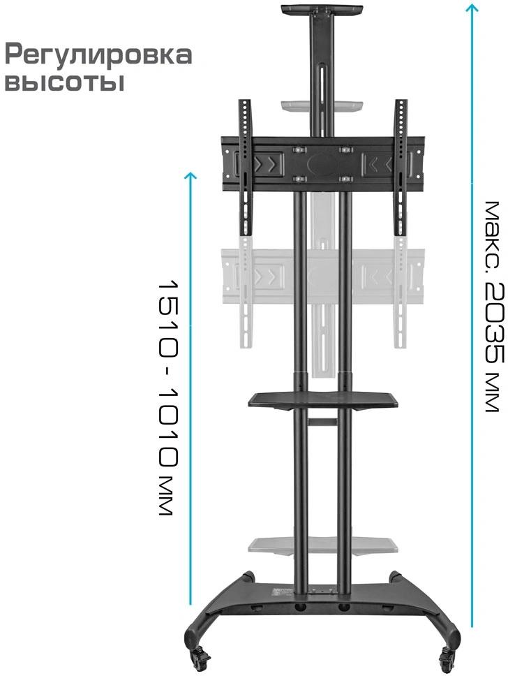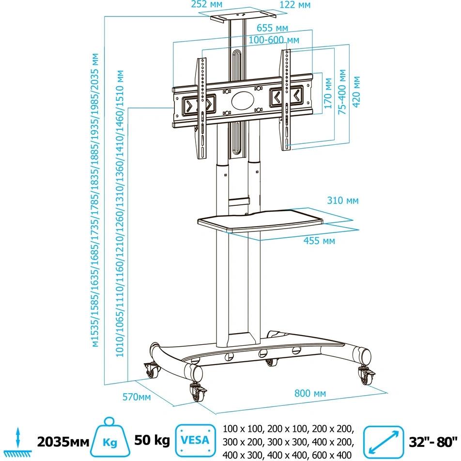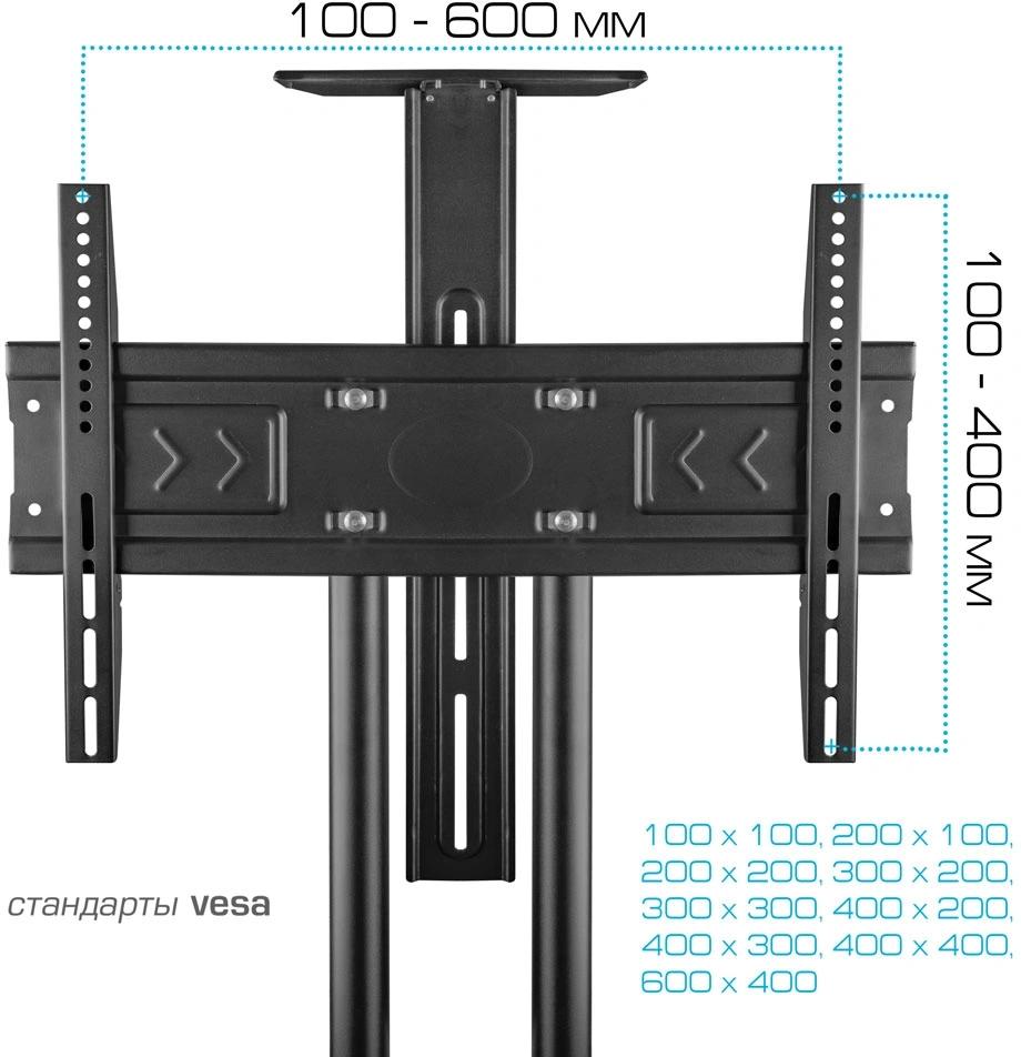 Универсальная система крепления для любого телевизора с посадочными отверстиями по горизонтали от 100 мм до 600 мм, по вертикали от 100 мм до 400 мм, Надежная стальная конструкция, Регулируемая высота до 2035 мм, Кабель канал удобная прокладка соединительных кабелей внутри штанги