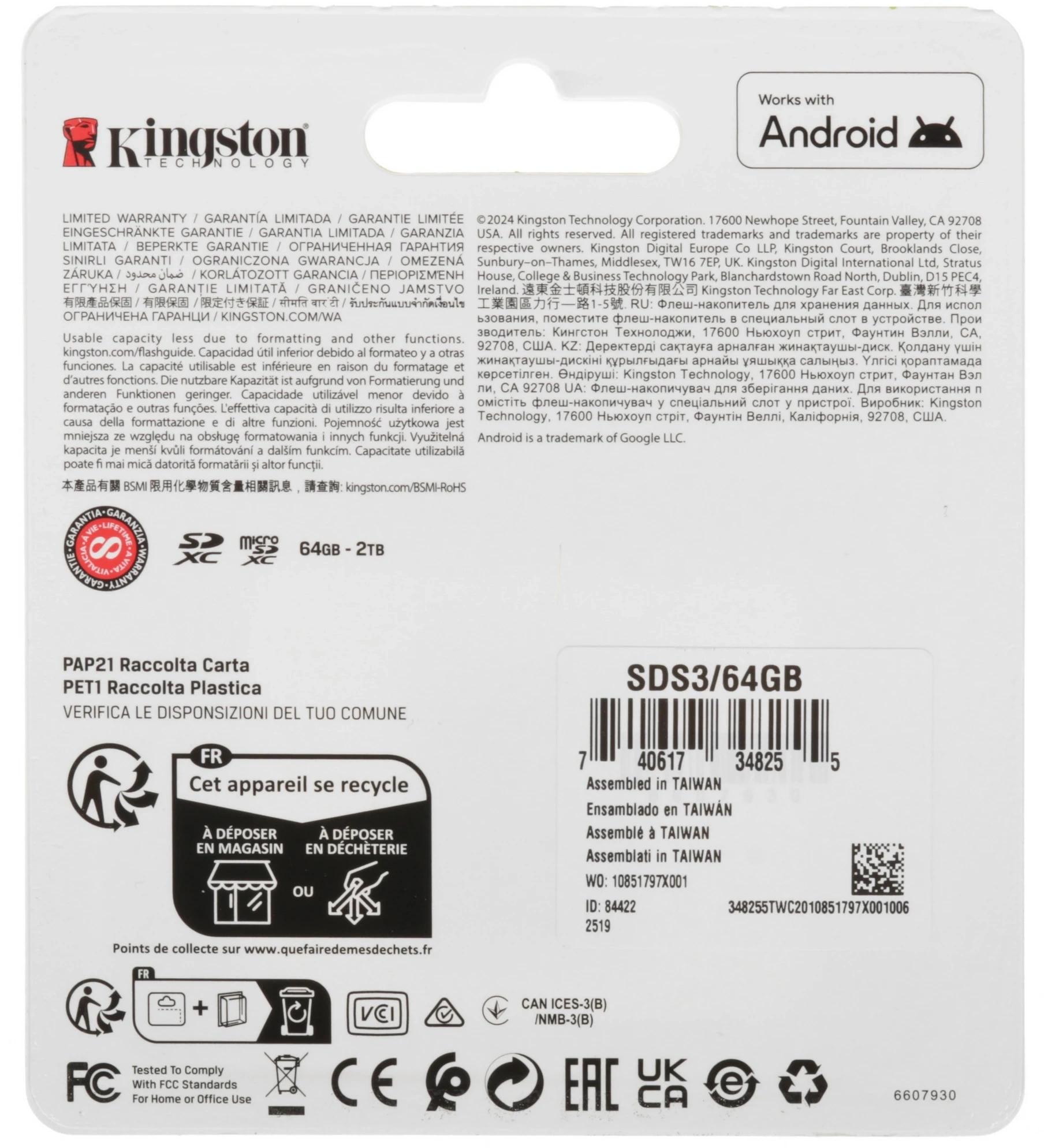 Флеш карта SDXC 64GB Kingston SDS3/64GB Canvas Select Plus V10 w/o adapter