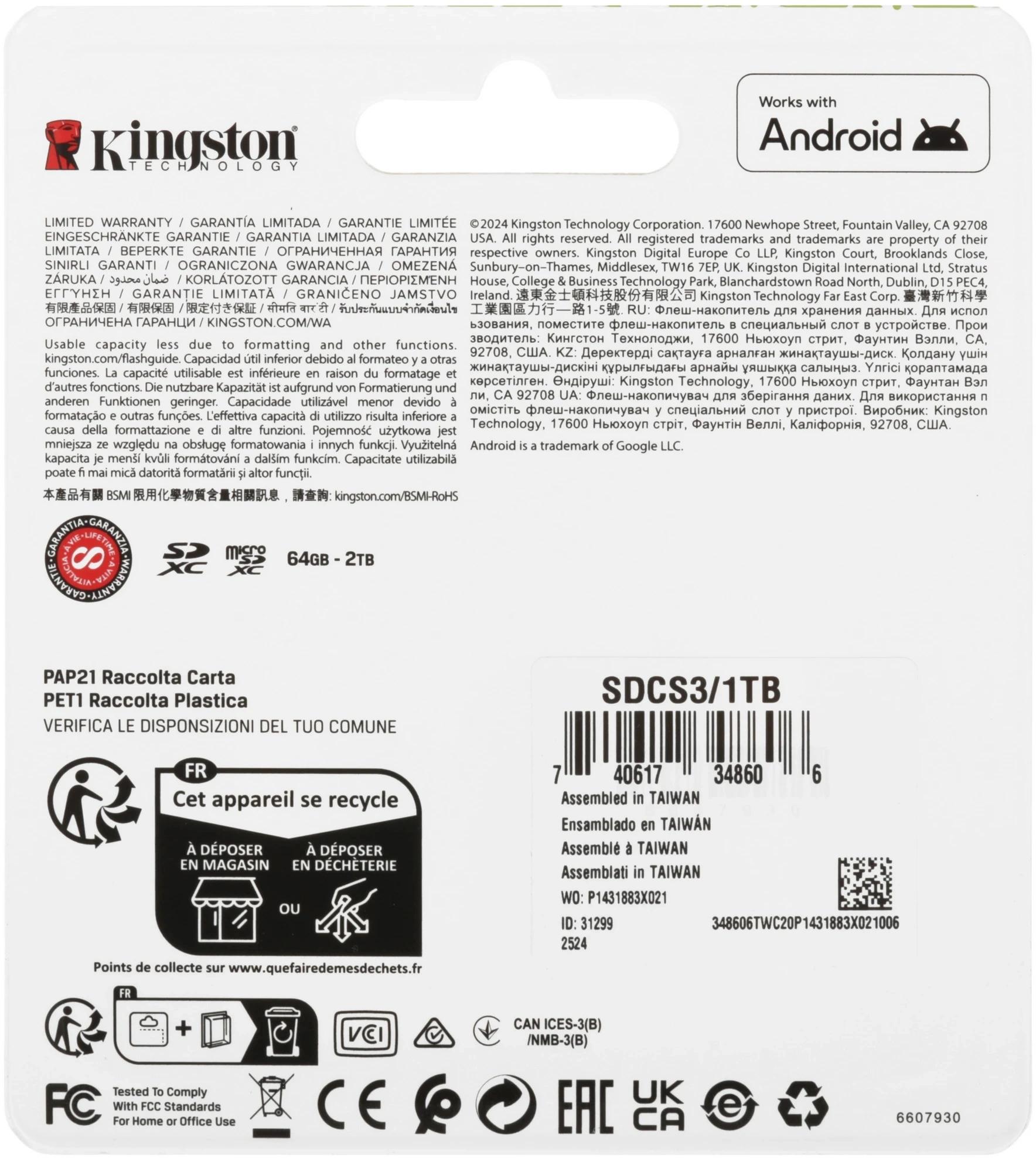 Флеш карта microSDXC 1TB Kingston SDCS3/1TB Canvas Select Plus V30 A1 + adapter