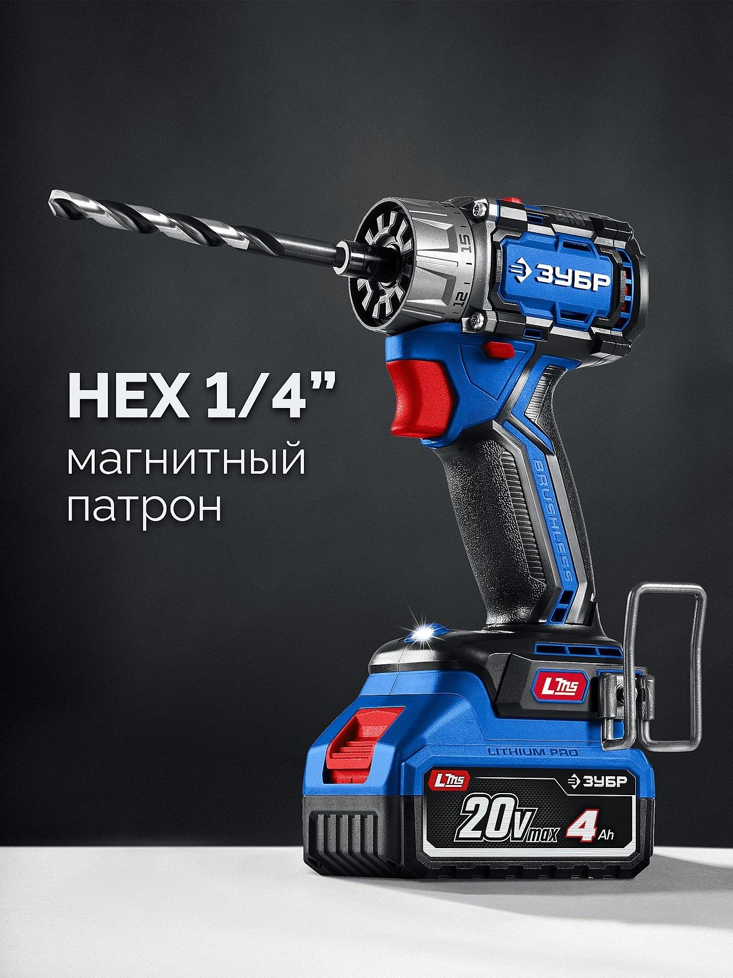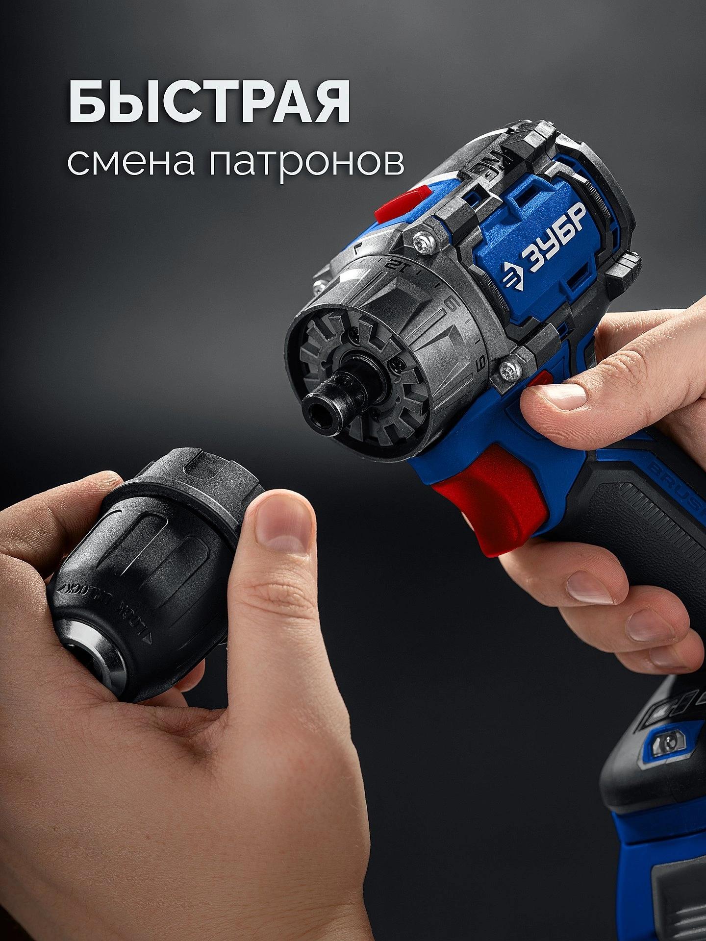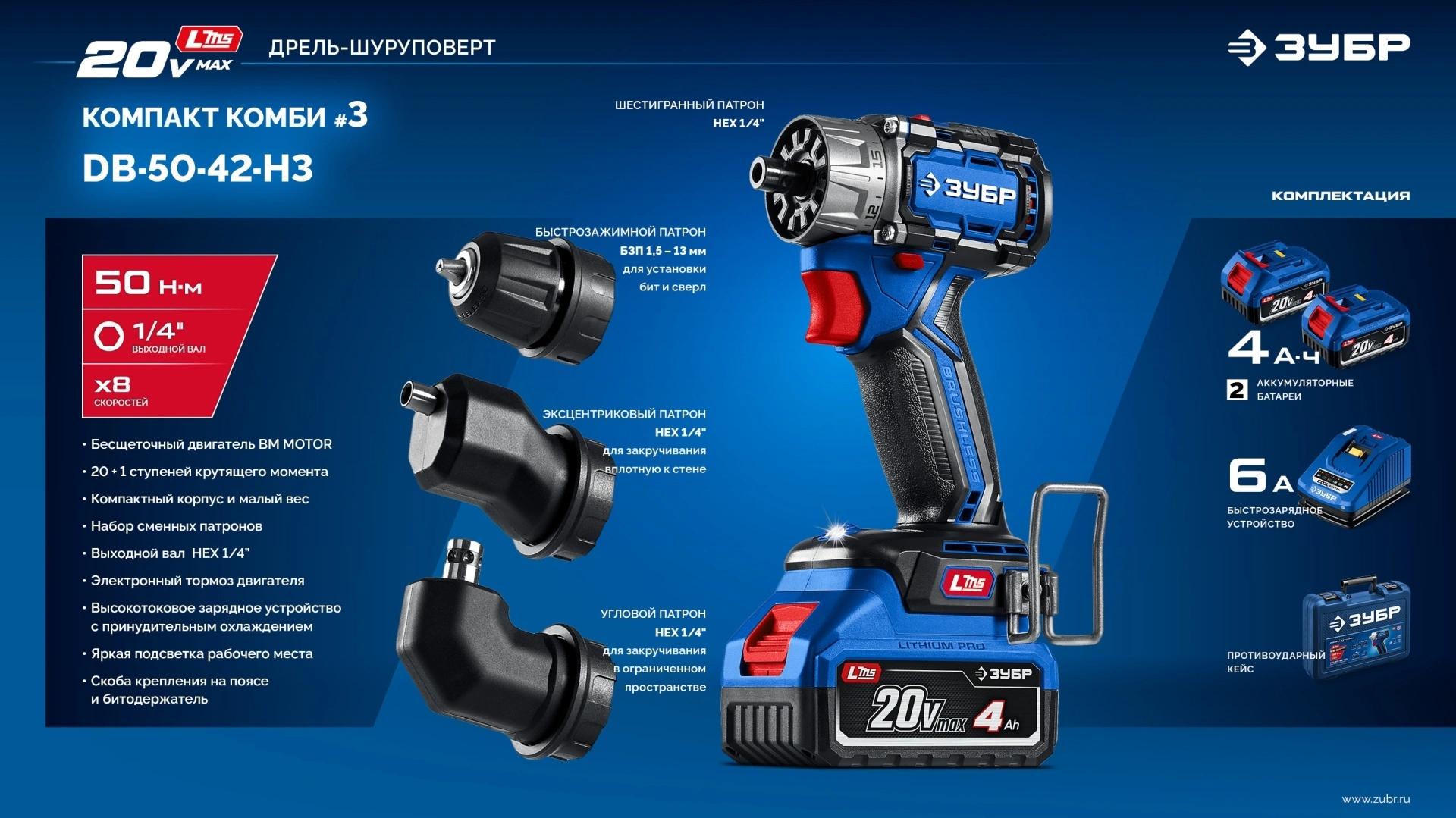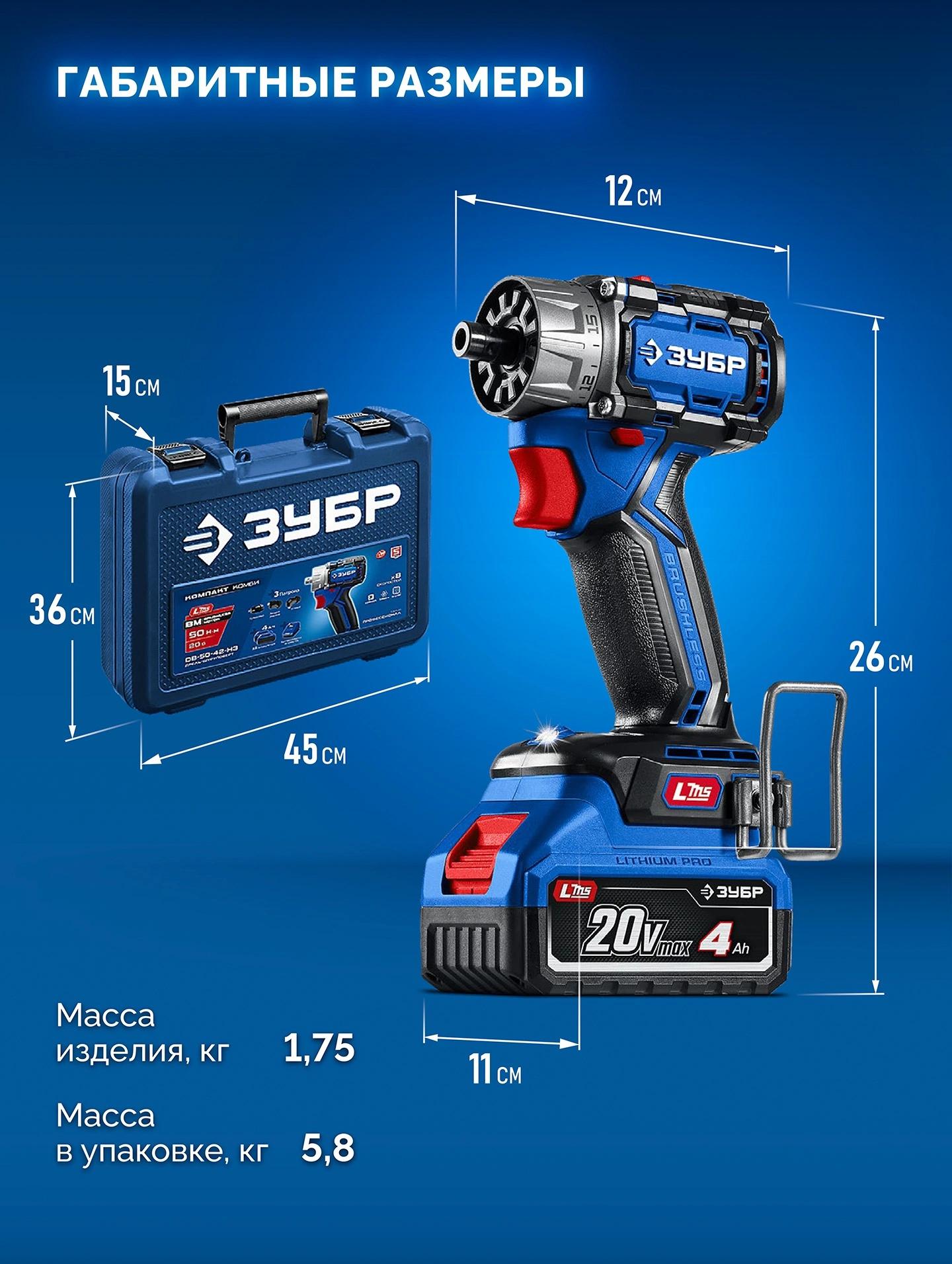 Дрель-шуруповерт, патрон кулачковый, патрон эксцентриковый, патрон угловой, аккумулятор - 2 шт., зарядное устройство, скоба поясная, бита (50 мм., PH, PZ), битодержатель, кейс, руководство по эксплуатации.