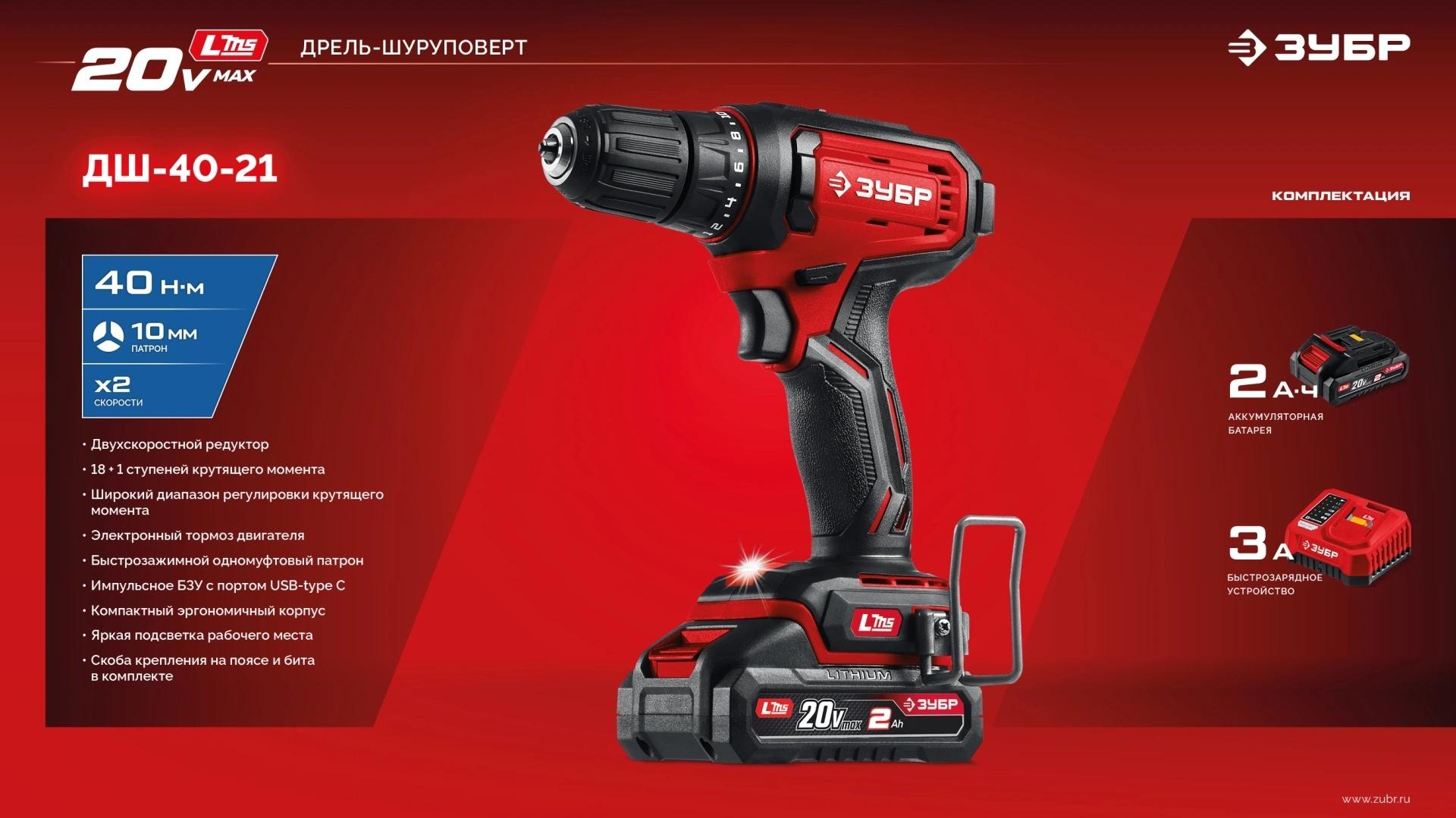 Дрель-шуруповерт - 1 шт. Аккумулятор - 1 шт. Зарядное устройство - 1 шт. Бита - 1 шт. Скоба крепления - 1 шт. Руководство по эксплуатации - 1 экз.