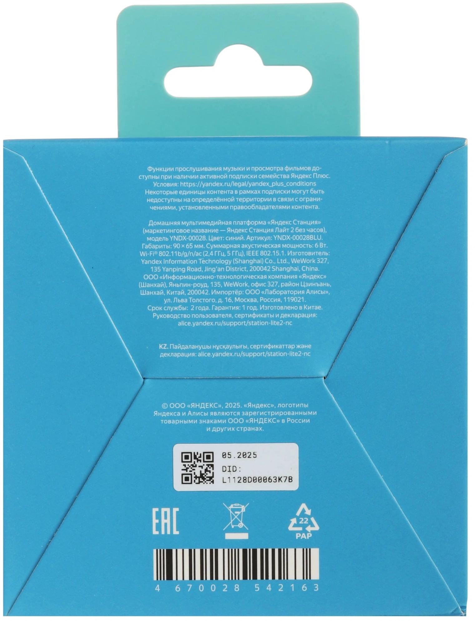 Умная колонка Yandex Станция Лайт 2 без часов Алиса синий 6W 1.0 BT/Wi-Fi 10м (YNDX-00028BLU)